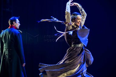 Анастасия Епифанова (Бэла) и Андрей Финягин (Человек, которого принимают за Печорина) на показе спектакля «Герой нашего времени?» в постановке режиссера Антона Яковлева перед премьерой в Московском драматическом театре имени Гоголя.