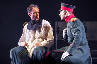 Андрей Кондратьев (Апфельбаум, спирит, иллюзионист) и Андрей Финягин (Человек, которого принимают за Печорина) (слева направо) на показе спектакля «Герой нашего времени?» в постановке режиссера Антона Яковлева перед премьерой в Московском драматическом театре имени Гоголя.