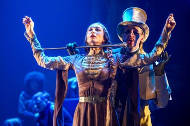 Анастасия Епифанова (Бэла) и Андрей Кондратьев (Апфельбаум, спирит, иллюзионист) (слева направо) на показе спектакля «Герой нашего времени?» в постановке режиссера Антона Яковлева перед премьерой в Московском драматическом театре имени Гоголя.