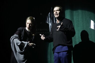 Показ спектакля «Школа для дураков» в Московском Художественном театре имени Чехова. Актер Артем Быстров и актриса Дарья Трухина.