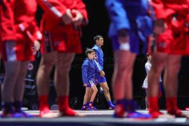 Спортсмены перед финальными поединками на международных соревнованиях «Лига боевого самбо» в Международном центре самбо.