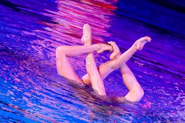 Двукратная олимпийская чемпионка по синхронному плаванию Мария Шурочкина и пятикратная чемпионка мира среда юниоров Анна Удовик во время шоу олимпийских чемпионов по синхронному плаванию «Спорт как искусство» в бассейне дворца спорта «Динамо», созданное трехкратными олимпийскими чемпионками Марией Киселевой и Ольгой Брусникиной.