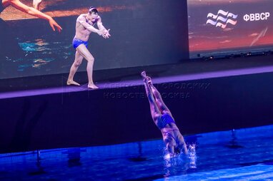 Акробаты Кирилл Чипизубов и Анелия Сахвалиева во время шоу олимпийских чемпионов по синхронному плаванию «Спорт как искусство» в бассейне дворца спорта «Динамо», созданное трехкратными олимпийскими чемпионками Марией Киселевой и Ольгой Брусникиной.