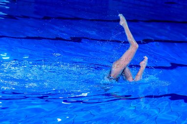 Чемпионка России по синхронному плаванию среди юниоров Валерия Плеханова во время шоу олимпийских чемпионов по синхронному плаванию «Спорт как искусство» в бассейне дворца спорта «Динамо», созданное трехкратными олимпийскими чемпионками Марией Киселевой и Ольгой Брусникиной.