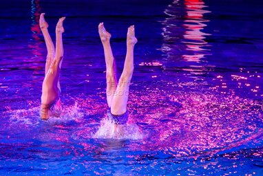 Синхронистки Александра Пищикова и Варвара Барабашова шоу олимпийских чемпионов по синхронному плаванию «Спорт как искусство» в бассейне дворца спорта «Динамо», созданное трехкратными олимпийскими чемпионками Марией Киселевой и Ольгой Брусникиной.