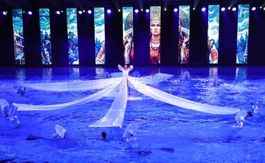 Солист Государственного академического ансамбля народного танца имени Игоря Моисеева Рамиль Мехдиев во время шоу олимпийских чемпионов по синхронному плаванию «Спорт как искусство» в бассейне дворца спорта «Динамо», созданное трехкратными олимпийскими чемпионками Марией Киселевой и Ольгой Брусникиной.