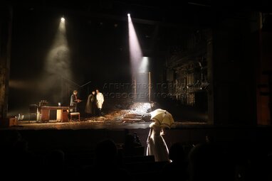 Сцена из предпремьерного показа спектакля «Герой нашего времени» в постановке Сергея Тонышева по мотивам романа Михаила Лермонтова на основной сцене Московского театра на Таганке.