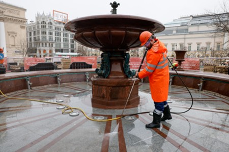 Промывка Театрального фонтана на одноименной площади в центре Москвы.