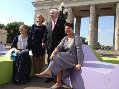 Первый заместитель руководителя Департамента культуры города Москвы Екатерина Проничева, генеральный директор Центрального парка культуры и отдыха им. Горького Ольга Захарова, Мэр Вены Михаэль Хойпль и глава Венского совета по туризму Рената Браунер (слева направо) во время торжественной церемонии передачи Парку Горького скамеек из Музейного квартала Вены.