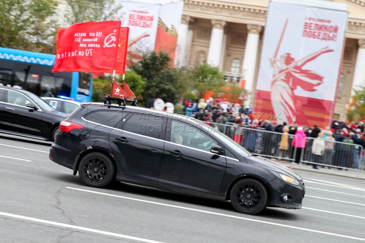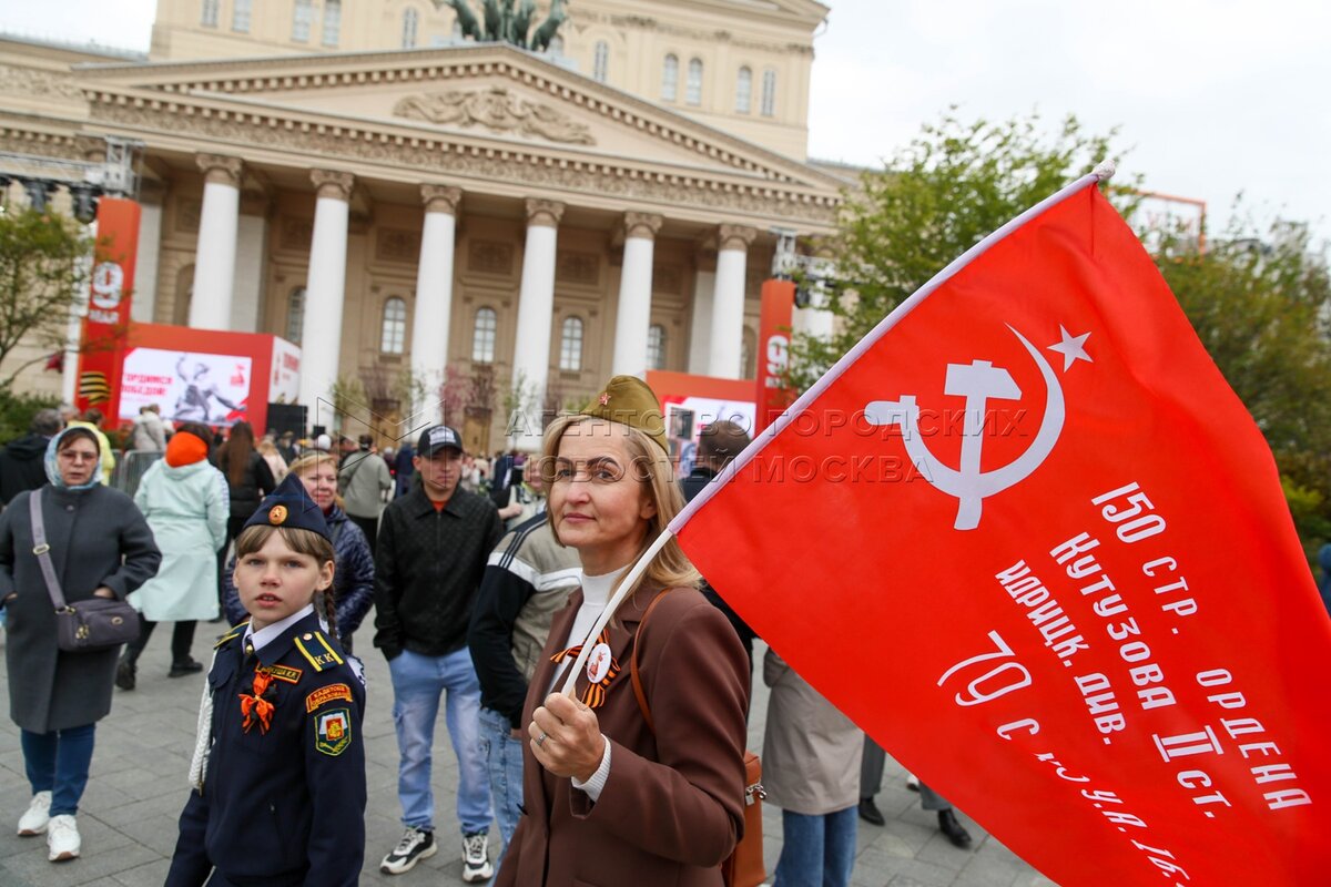 Мужчина со знаменем Победы на Театральной площади во время празднования 80-й годо...