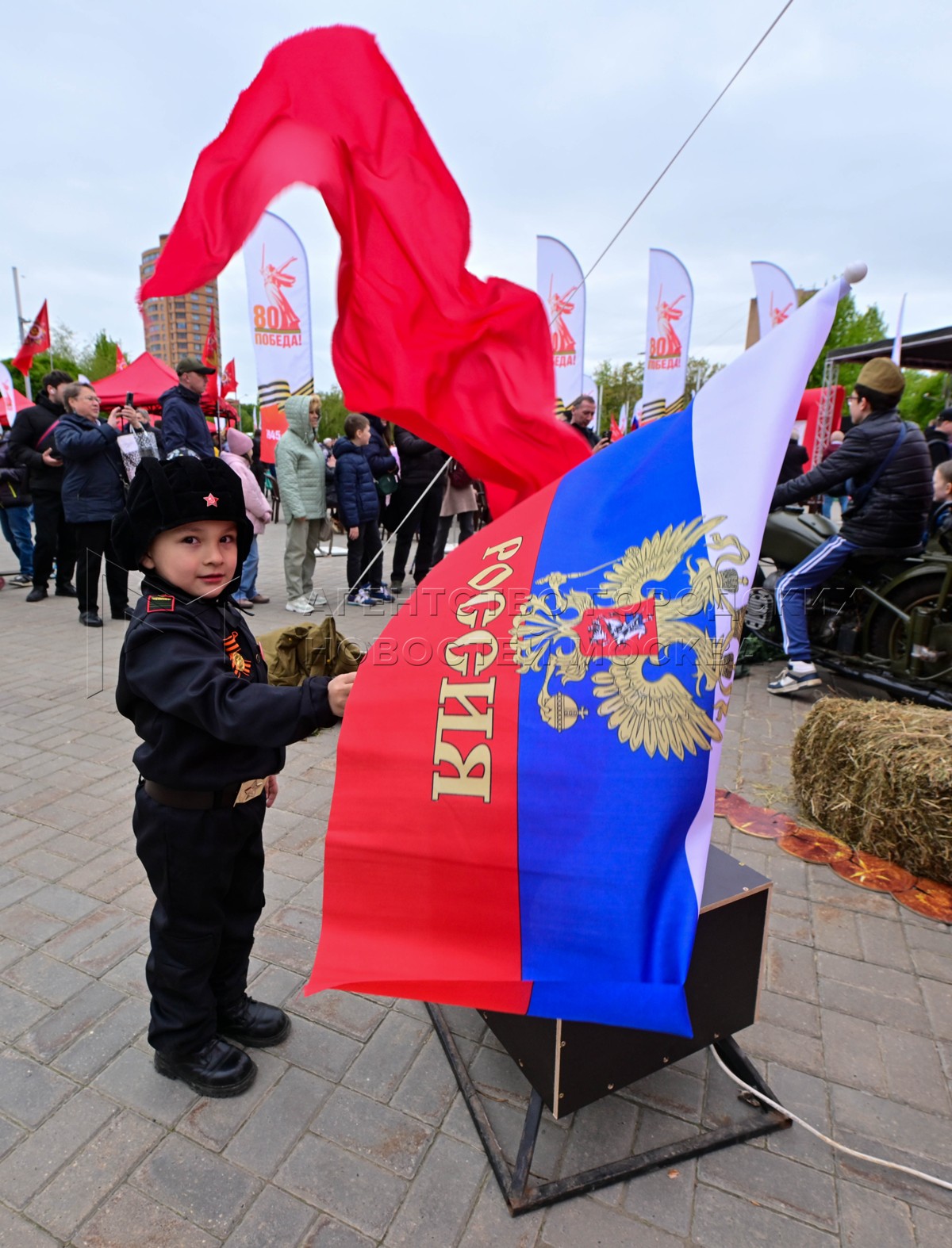 Мужчина с флагом на Тверской улице во время празднования 80-й годовщины Победы в ...