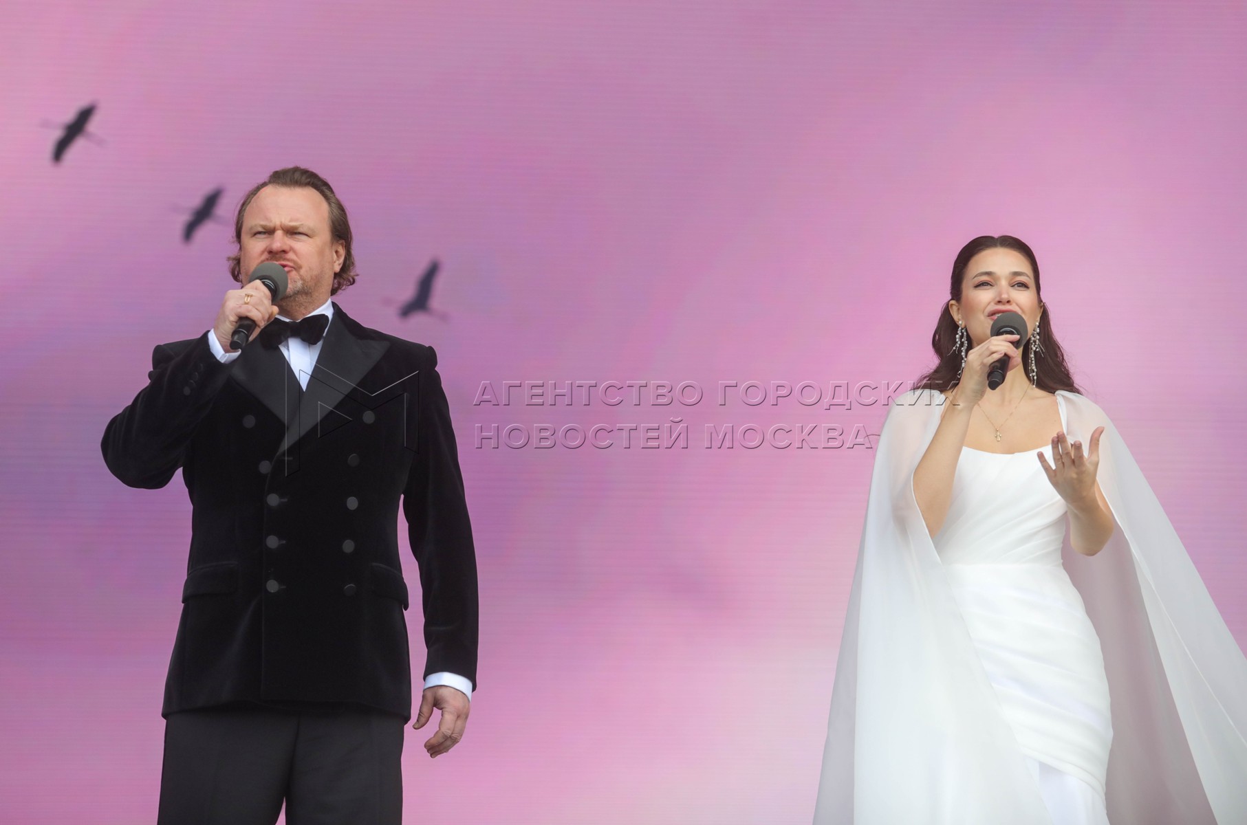 Певцы Сергей Скороходов и Пола Романова. Концертная программа «Песни Победы. Голоса поколений», подготовленная командой движения Олега Газманова «Родники». Празднование 80-летия Великой Победы на Поклонной горе.