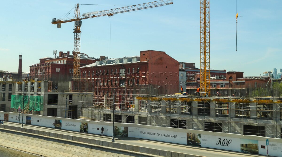 Строительные работы проекта комплексного развития территории на первой линии Болотной набережной рядом с арт-пространством ГЭС-2 по программе реорганизации территории бывшей кондитерской фабрики «Красный Октябрь».