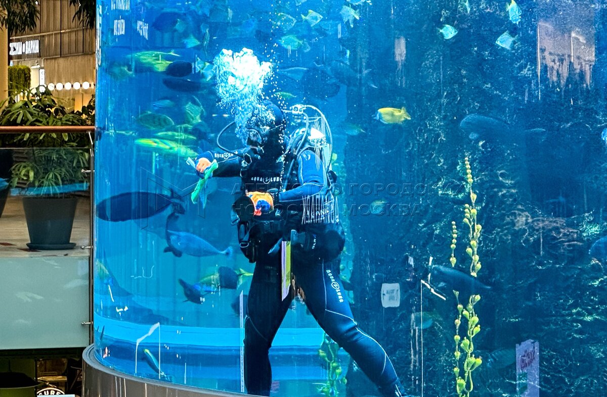 Водолаз чистит самый высокий цилиндрический аквариум (он является вторым по высоте цилиндрическим аквариумом в мире) в ТРЦ «Авиапарк».