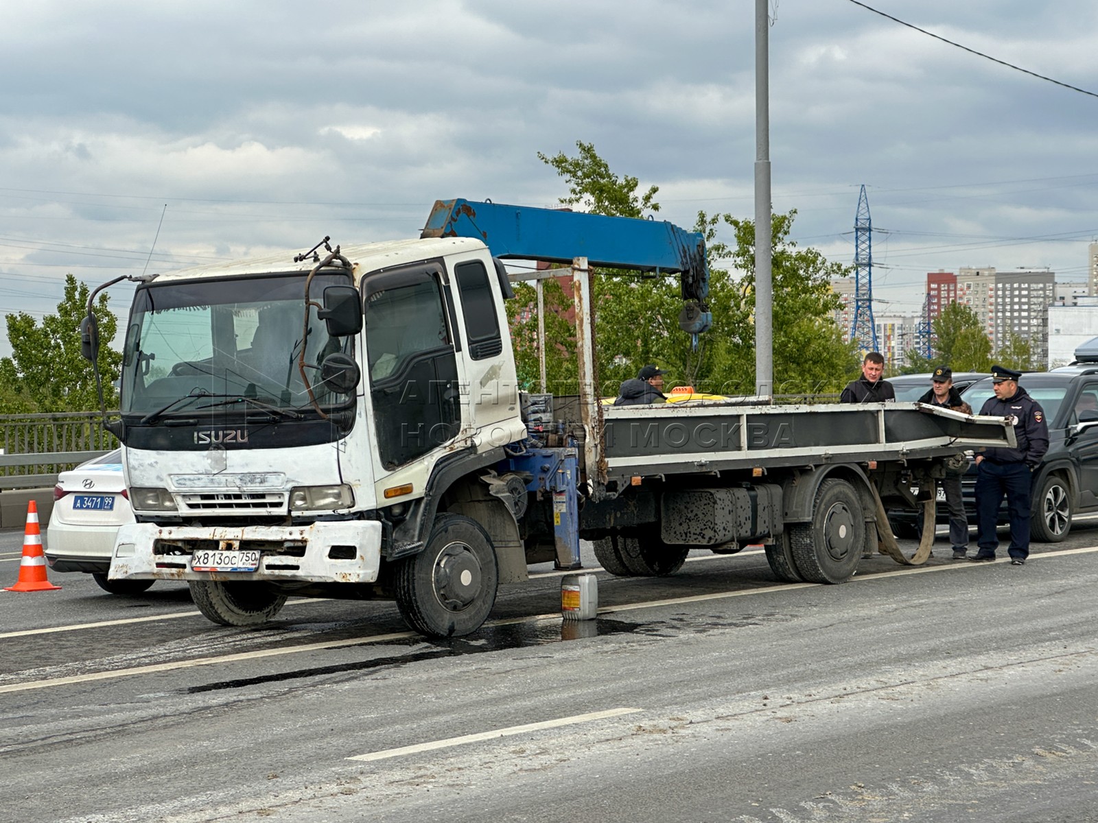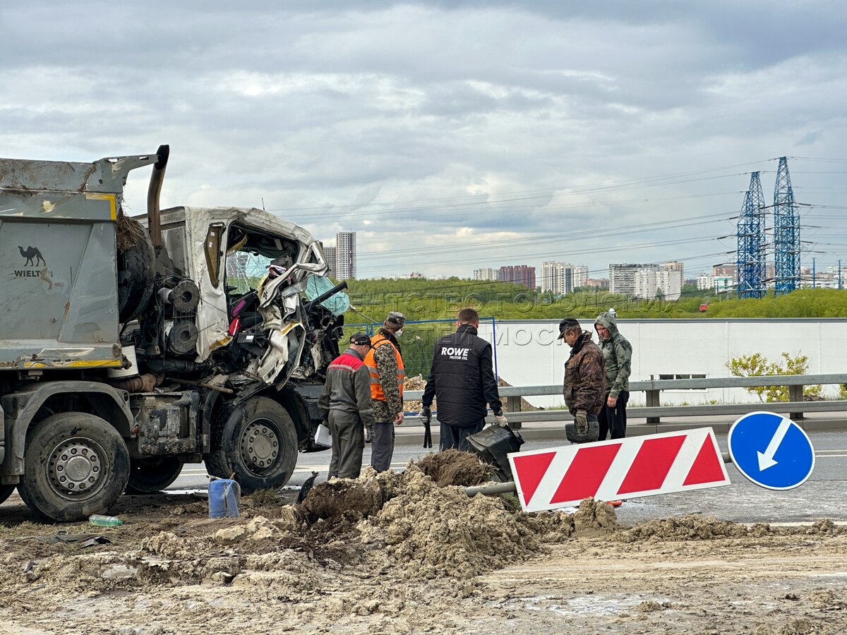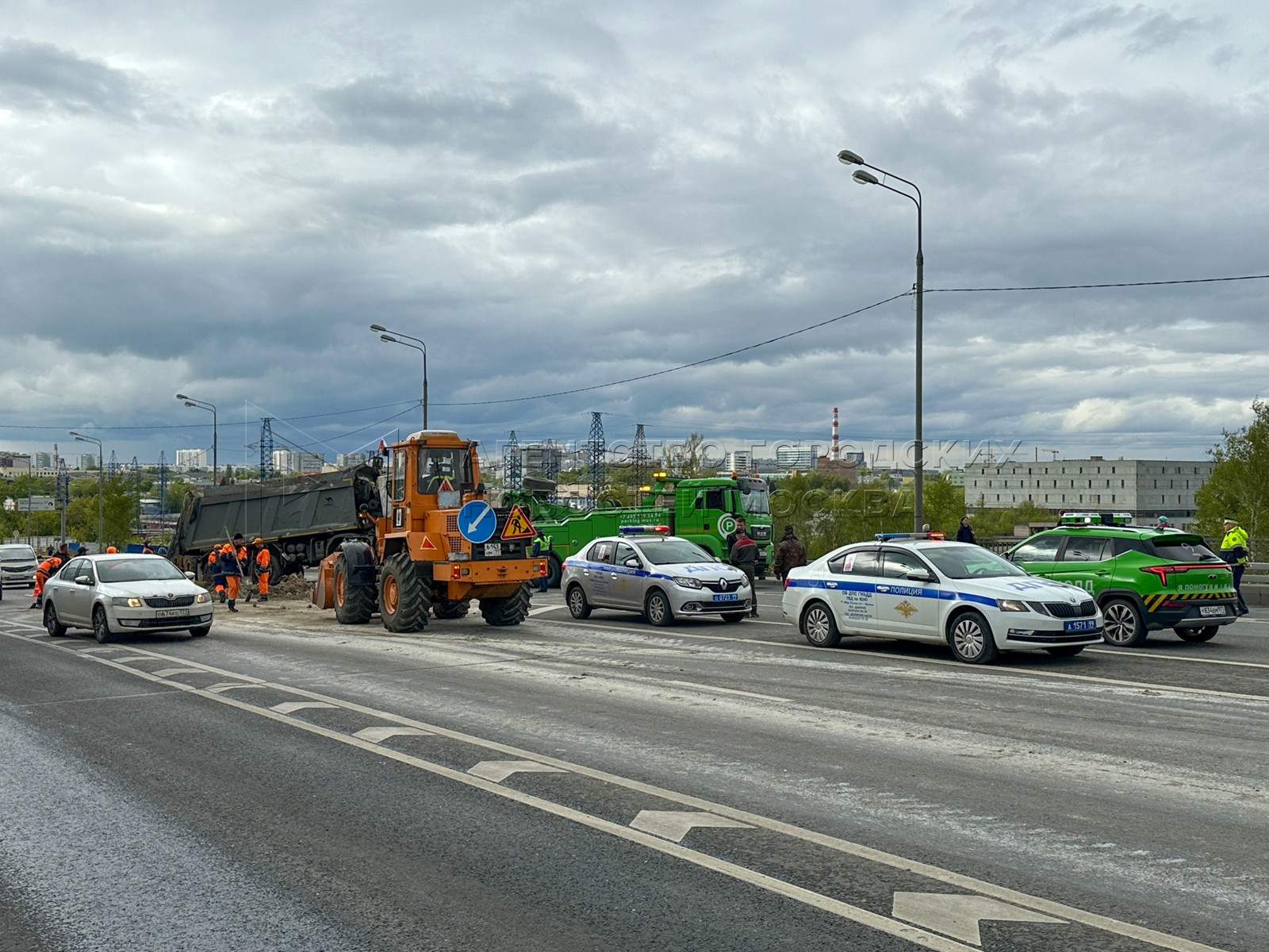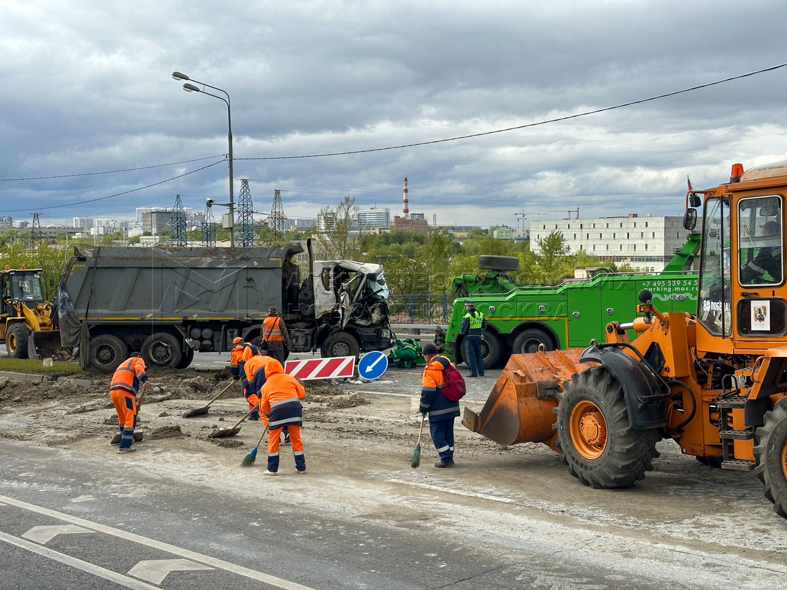 Устранение последствий ДТП с участием самосвала и грузовика-манипулятора в районе Покровского путепровода на ул. Подольских Курсантов.