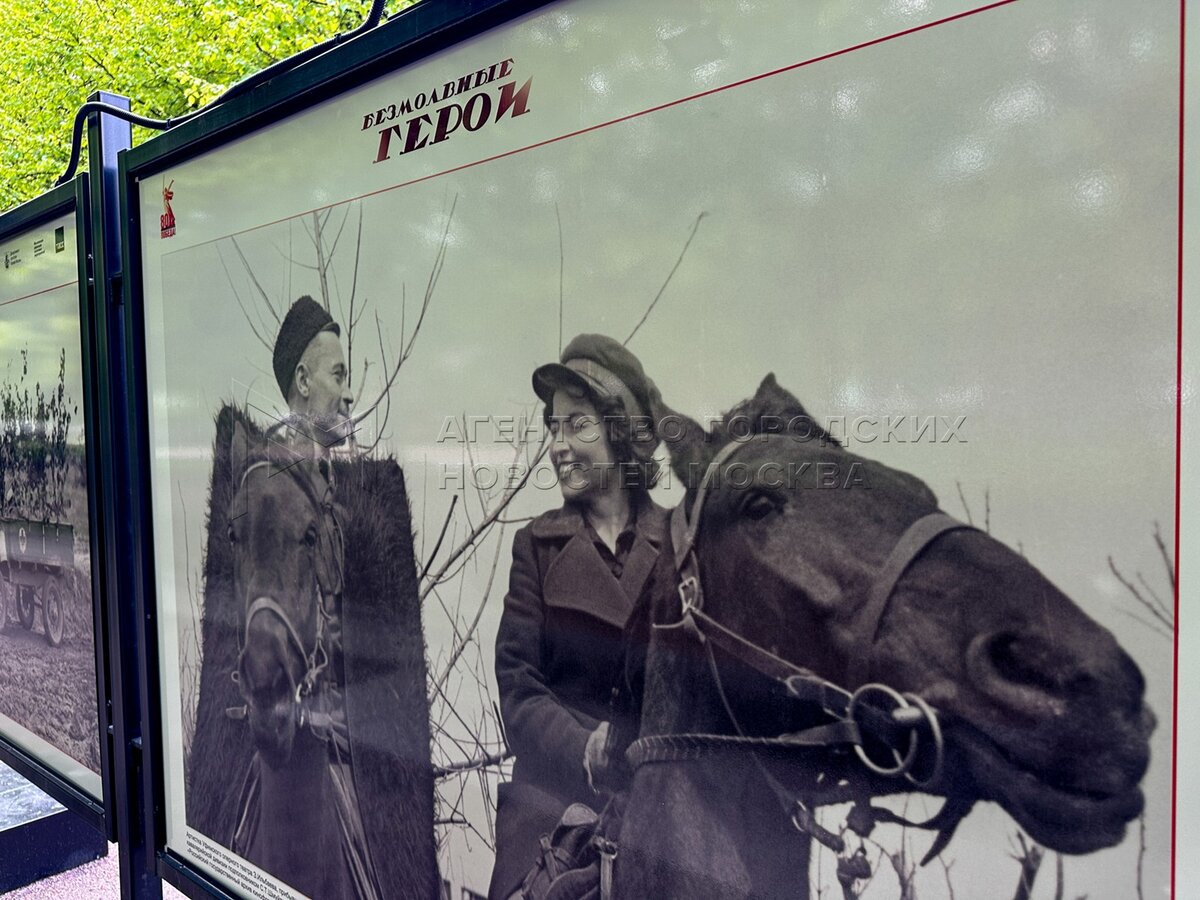 Фотовыставка «Безмолвные герои» на Цветном бульваре, посвященная собакам и лошадям на фронте и в тылу Великой Отечественной войны.