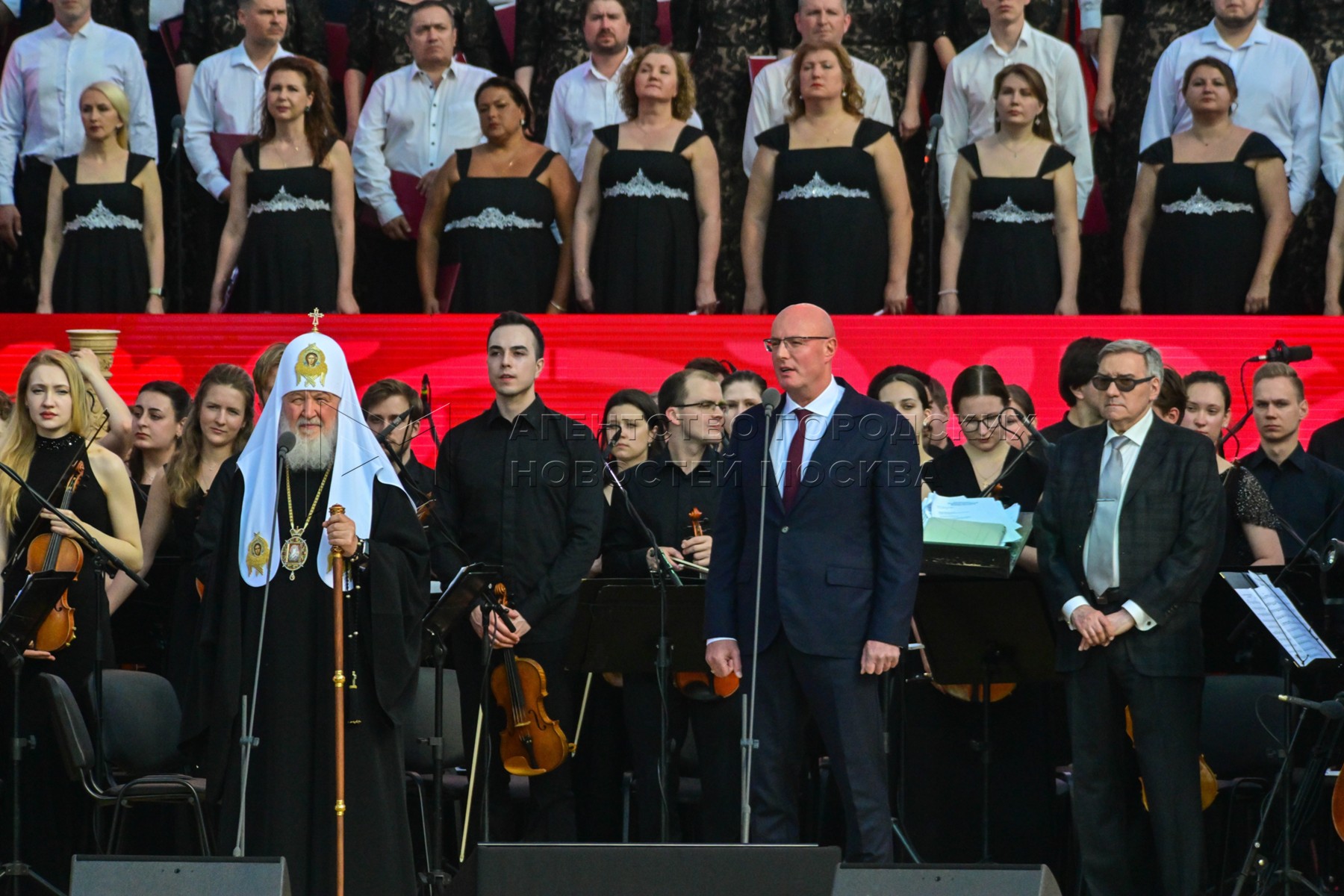 Святейший Патриарх Московский и всея Руси Кирилл (слева) и заместитель председателя правительства РФ Дмитрий Чернышенко (второй справа). Посвященный Дню славянской письменности и культуры концерт на Красной площади.