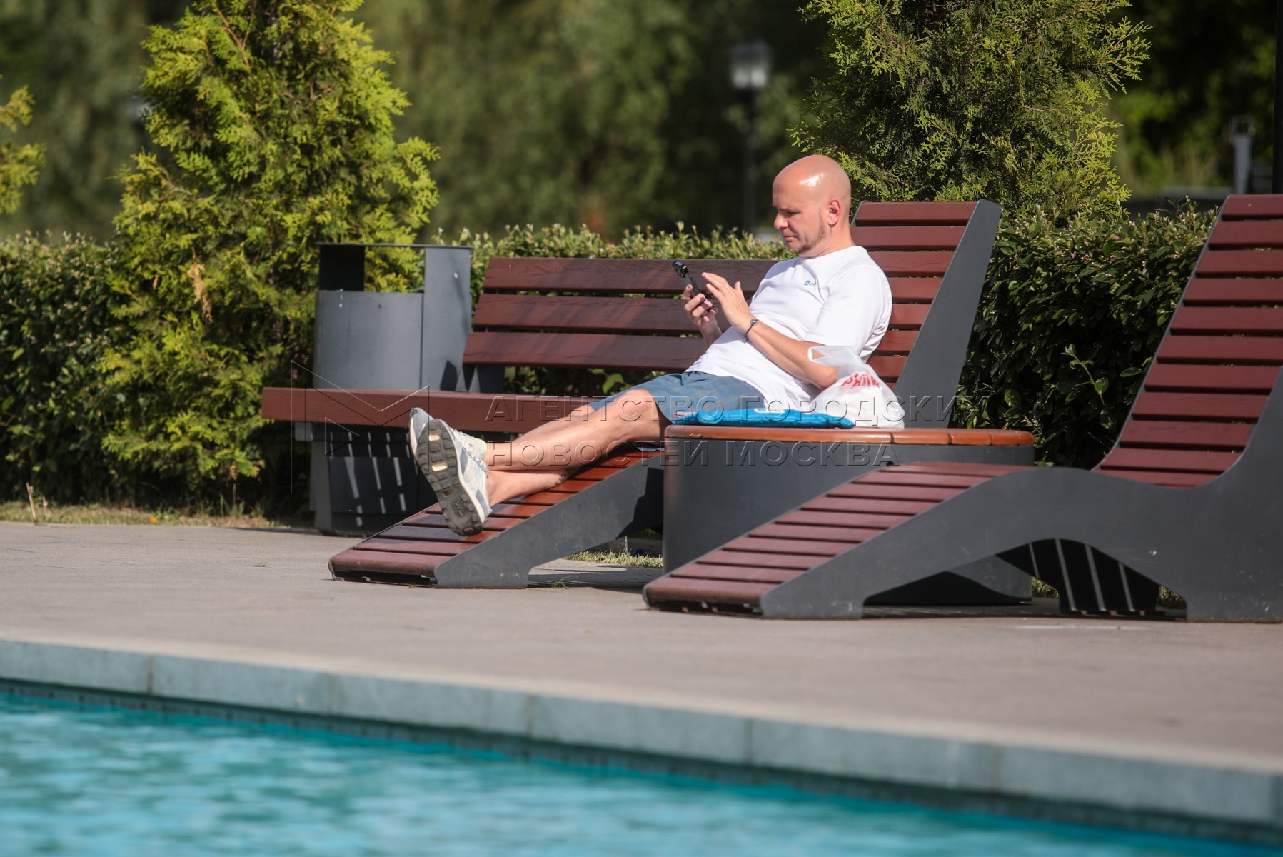 Отдых горожан в жаркий день в Москве. Женщина с мобильным телефоном.