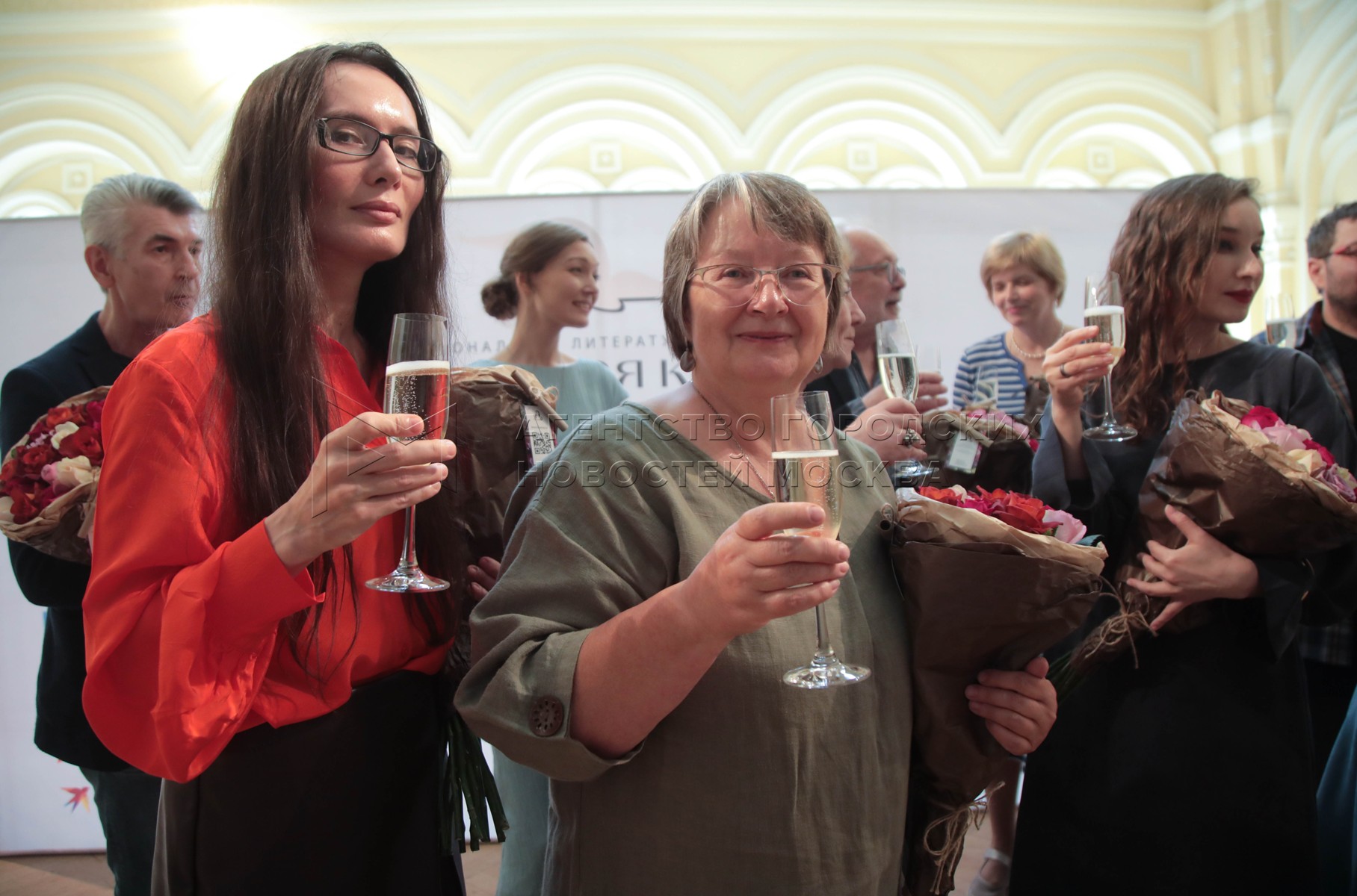 - Описание: Кинопродюсер Людмила Вебер (слева), вышедшая в финал конкурса «Большая книга» в номинации «Нон-фикшн» с произведением «Девочка и тюрьма», и лингвист Елена Левкиевская, вышедшая в финал в номинации «Нон-фикшн» с произведением «Белорусские мифы. От Мары и домашнего ужа до волколака и Злыдни» во время литературного обеда с объявлением финалистов XX сезона премии «Большая книга» в Демонстрационном зале ГУМ.