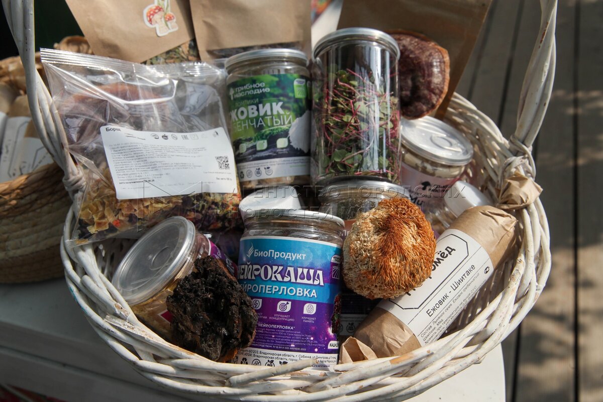 Грибы лисички для дегустации. Открытие на Тверской площади ярмарки фермерской про...