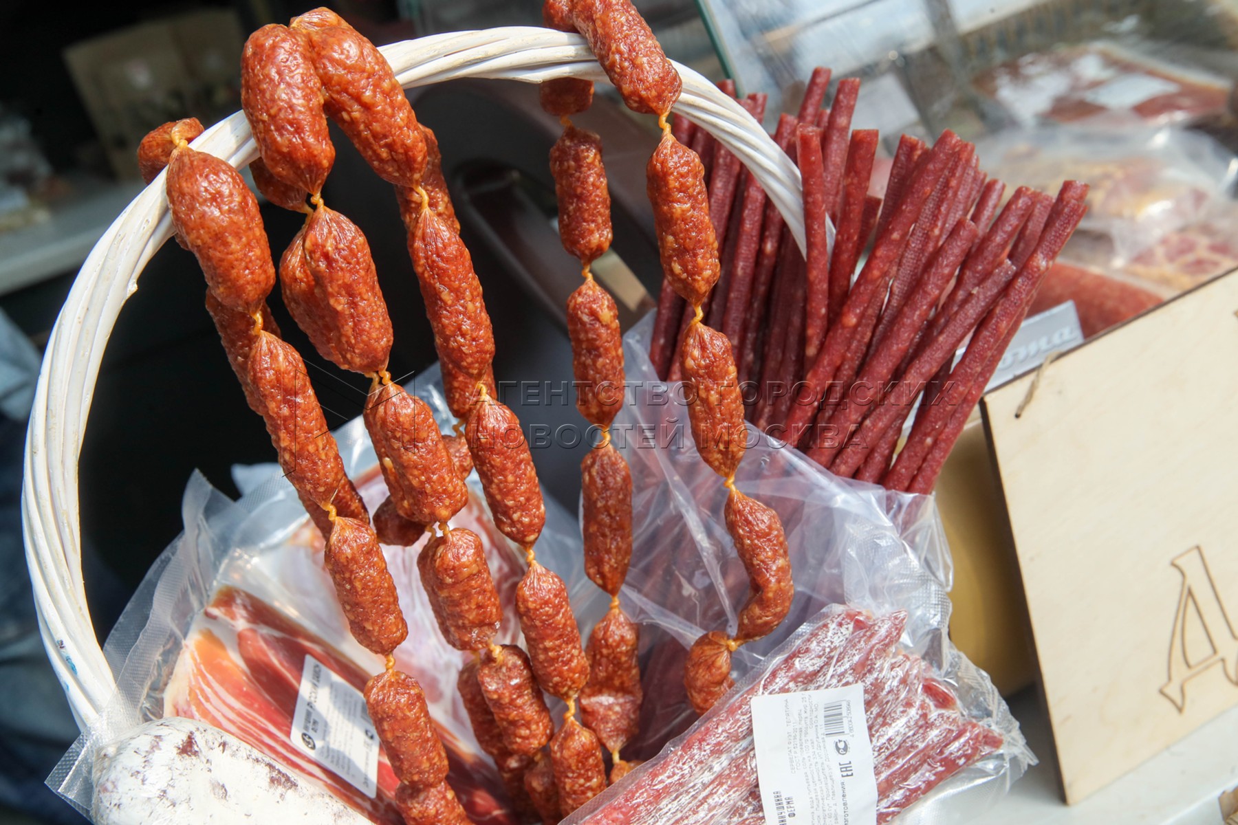 Колбасные изделия. Открытие на Тверской площади ярмарки фермерской продукции, при...