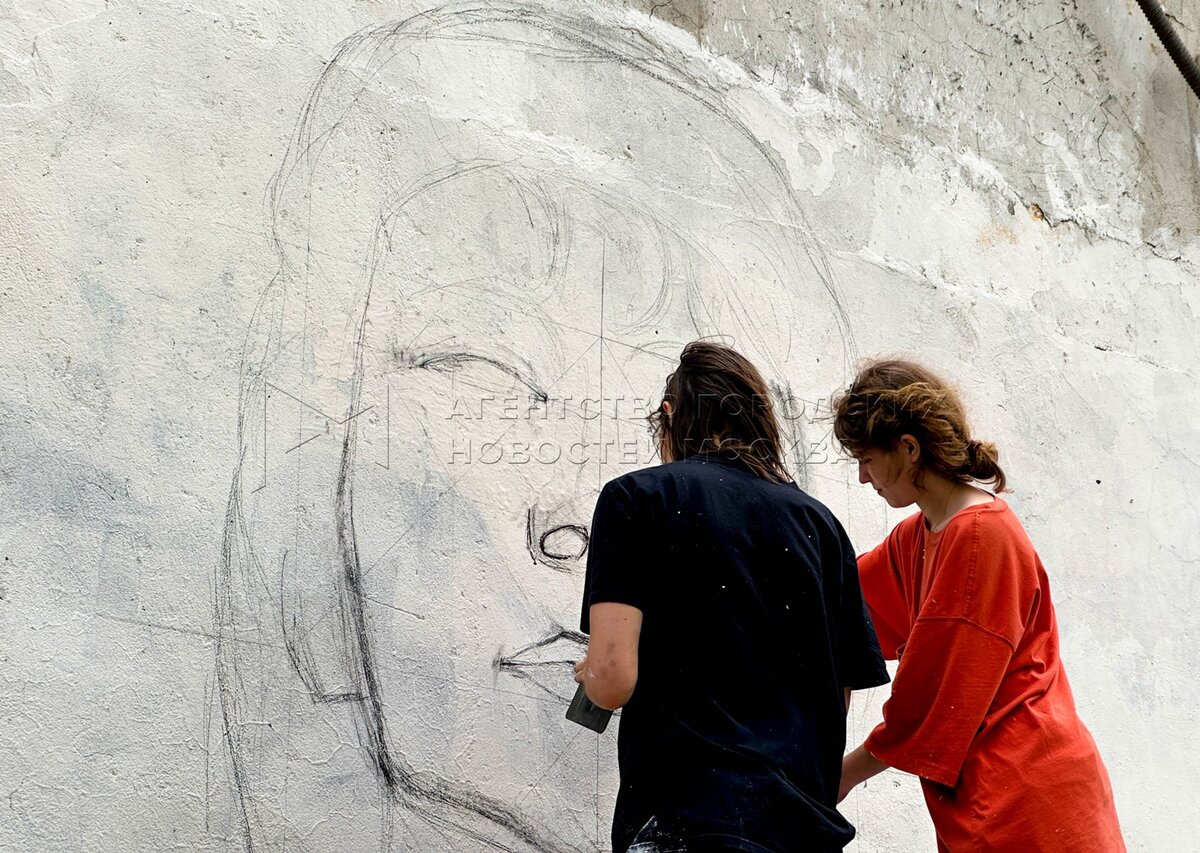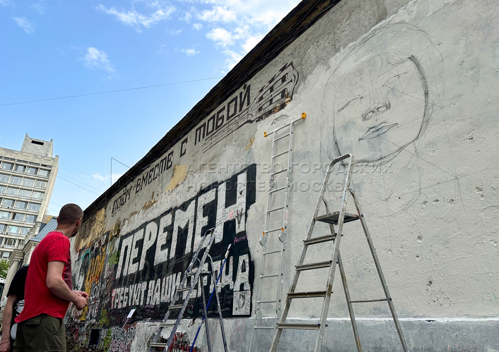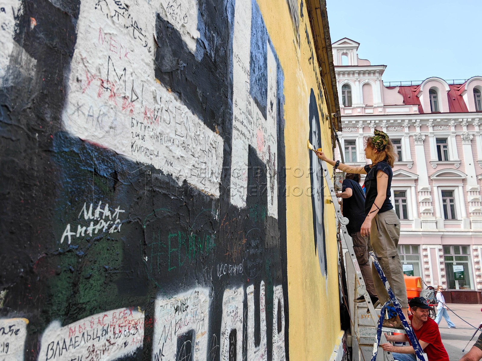Художники реставрируют стену Виктора Цоя на ул. Арбат к его дню рождения.