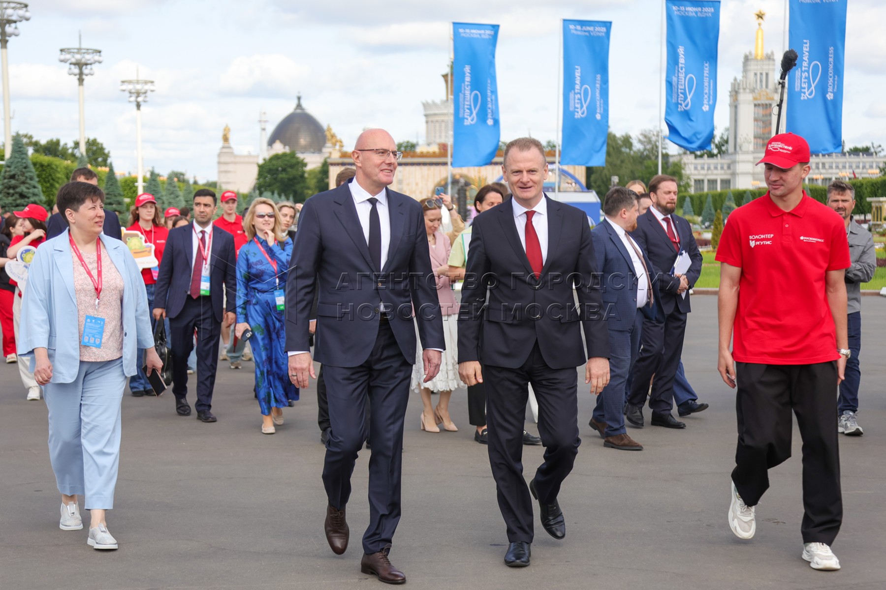 - Описание: Заместитель председателя правительства РФ Дмитрий Чернышенко (слева по центру) во время V Международного туристического форума «Путешествуй!» на территории ВДНХ.