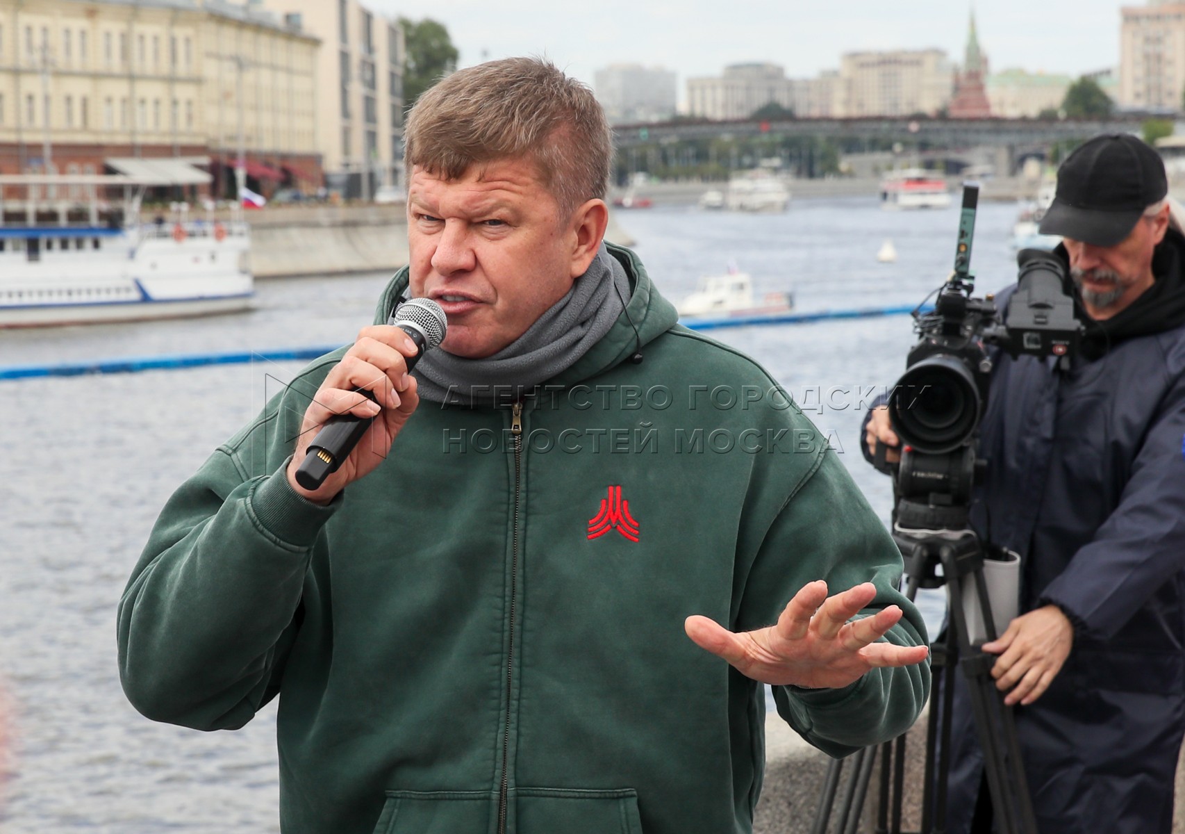 Спортивный комментатор, телеведущий Дмитрий Губерниев во время флешмоба «Катюша» ...