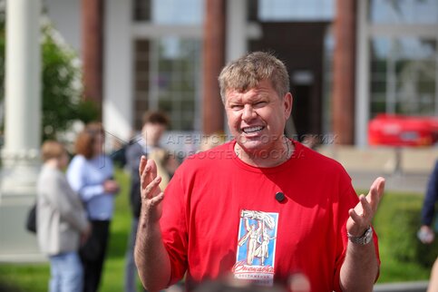- Описание: Телеведущий, спортивный комментатор Дмитрий Губерниев (слева) во время презентации авторской экскурсии на электрокарах «Зеленый маршрут с Дмитрием Губерниевым» по территории ВДНХ.