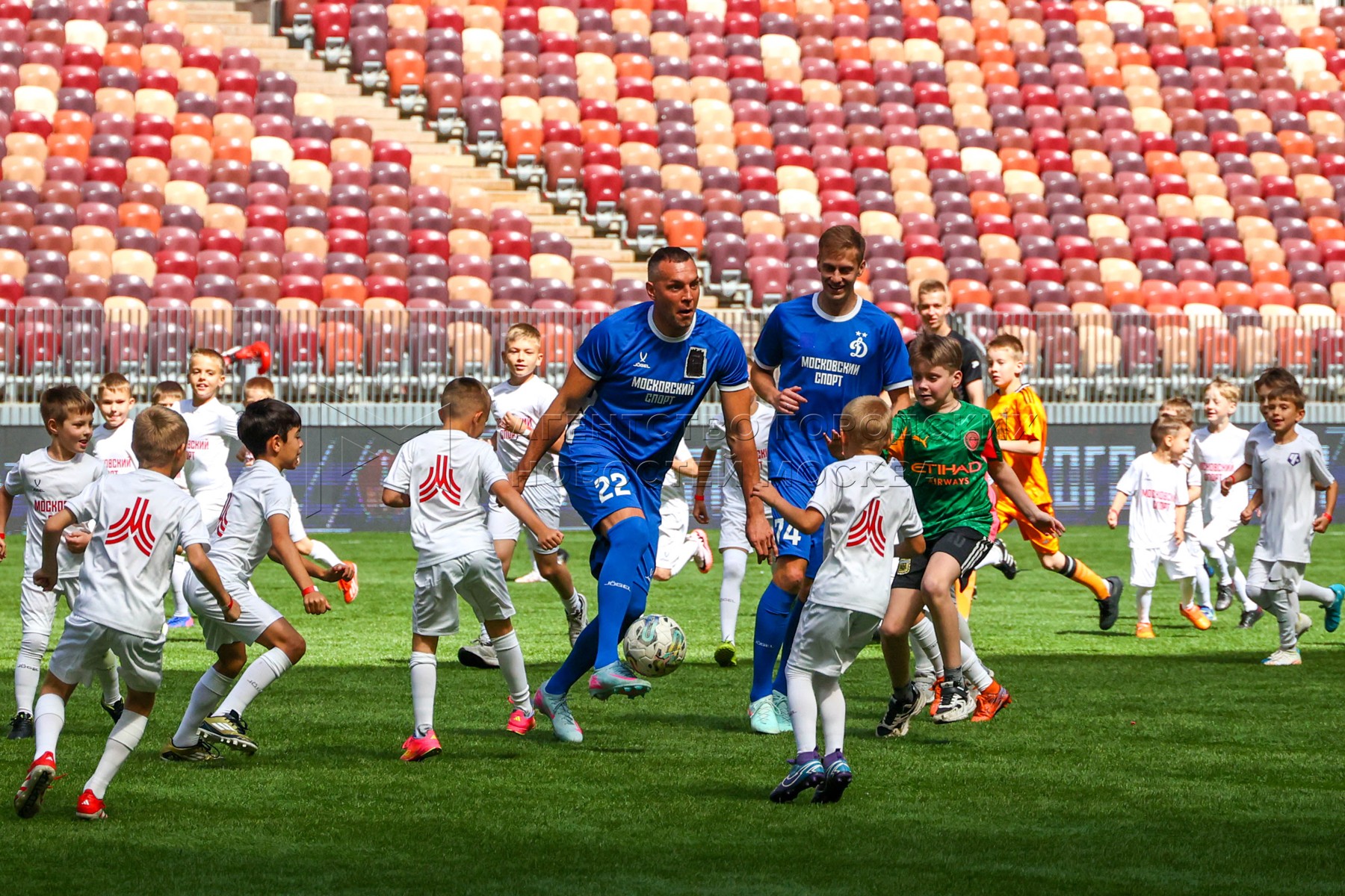 Игрок сборной России Артем Дзюба (в центре). Гала-матч с участием блогера Влада A4, который вместе с профессиональными спортсменами играет с командой из 100 детей, в рамках Дня Московского спорта в спорткомплексе «Лужники».