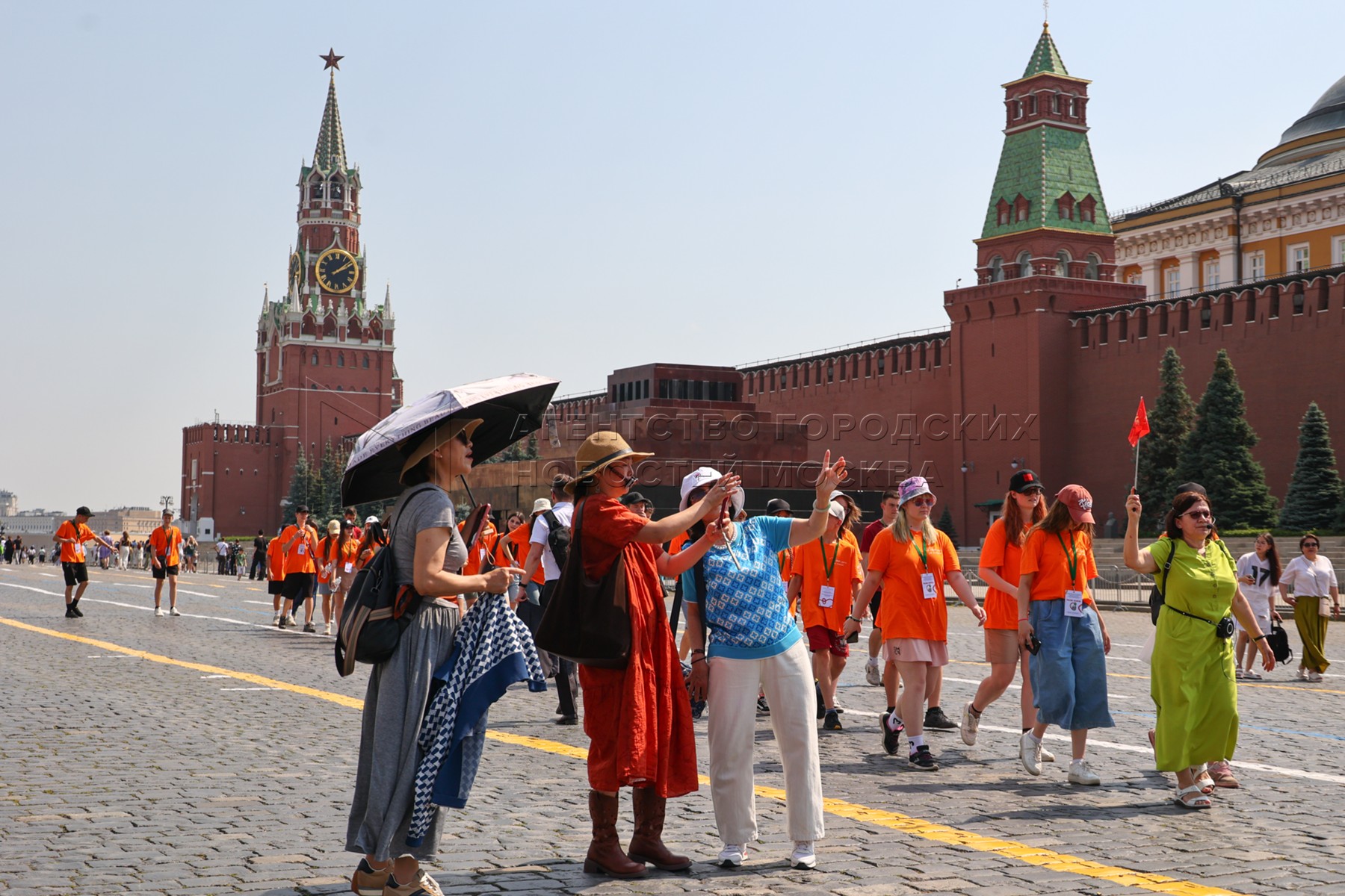 - Описание: Жаркая солнечная погода в центре Москвы 9 июля 2025 года. Туристы на Красной площади.