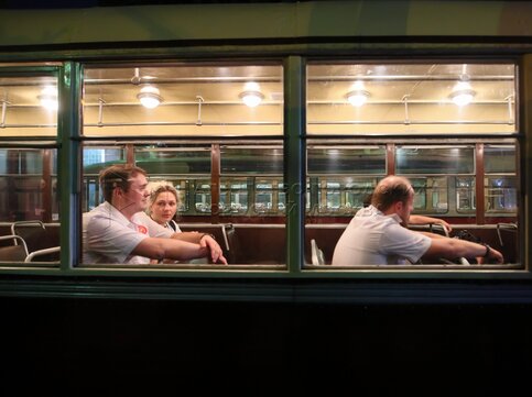 Табличка «Берегись трамвая». Генеральная репетиция парада исторического транспорт...