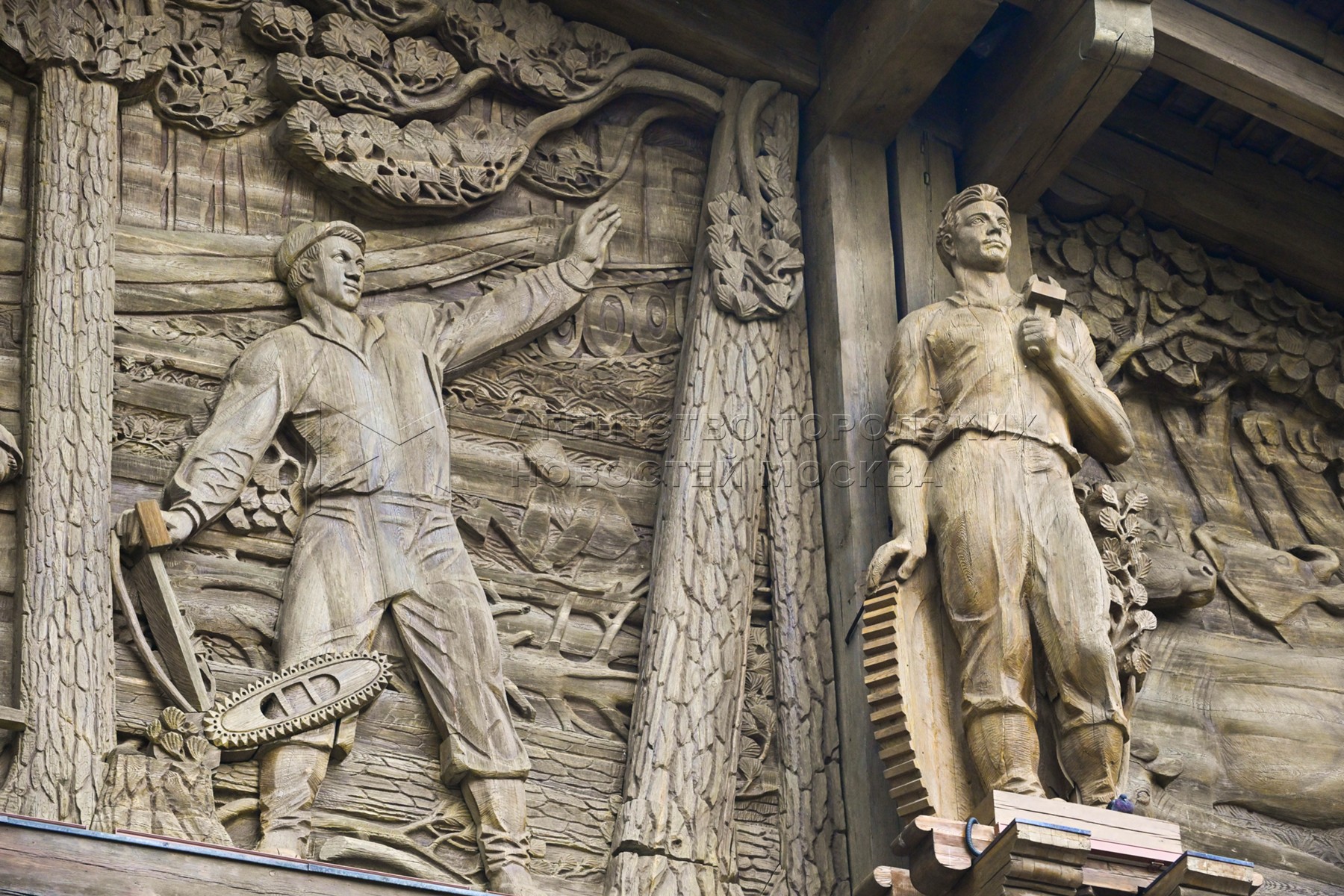 • Описание: Резьба на фронтоне отреставрированного павильона «Карелия» на ВДНХ – резной барельеф «Новая жизнь» работы скульптора Льва Кардашова.