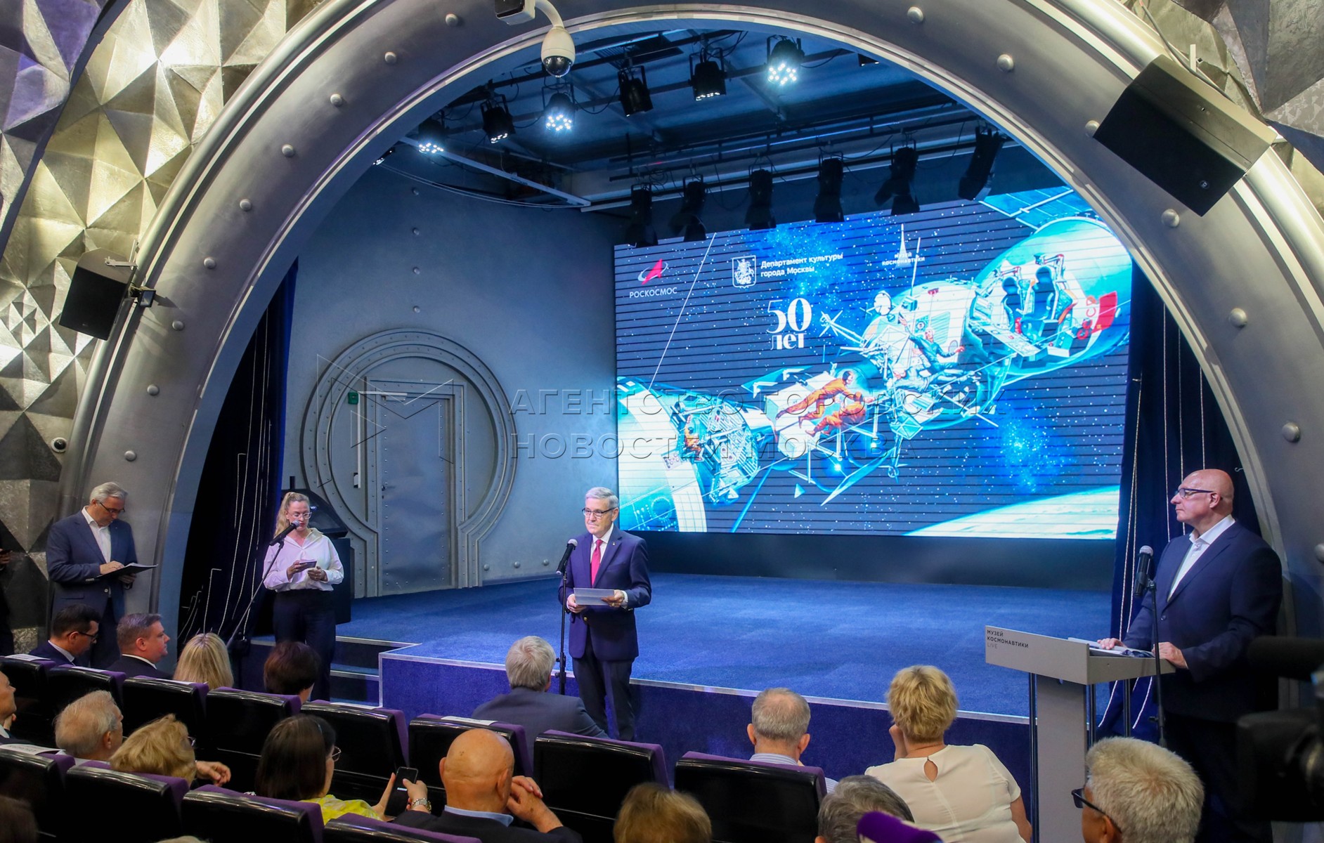 Открытие обновленной экспозиции зала «Международное сотрудничество на орбите», приуроченной к 50-летию программы «Союз – Аполлон», в Музее космонавтики.