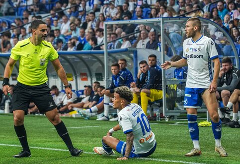 Главный судья Ян Бобровский, и игроки «Динамо» Бителло и Дмитрий Скопинцев (слева...
