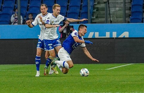 Игрок «Динамо» Гладышев Ярослав, игрок «Балтики» Денис Макаров и игрок «Динамо» Э...