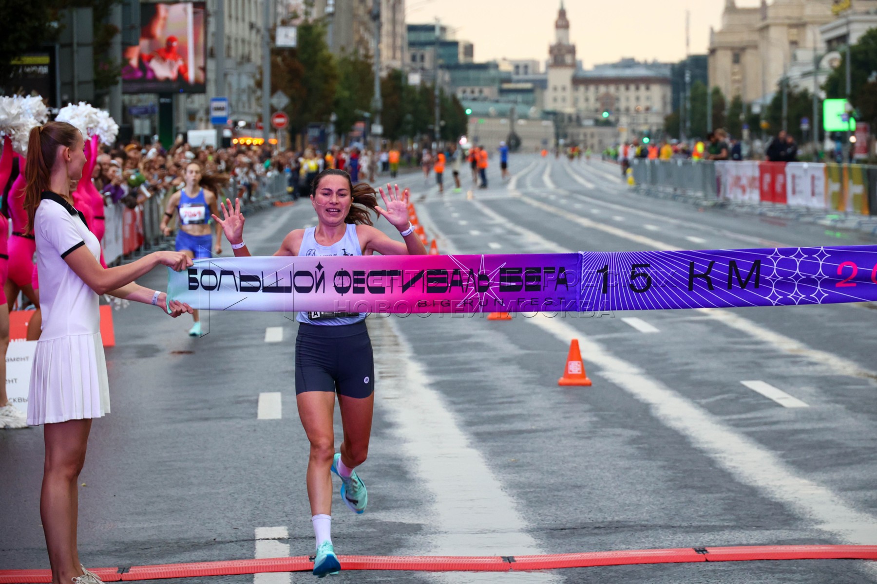 Дина Александрова финиширует первой в забеге среди женщин на 15 км. Большой фестиваль бега Big Run Fest в Москве.