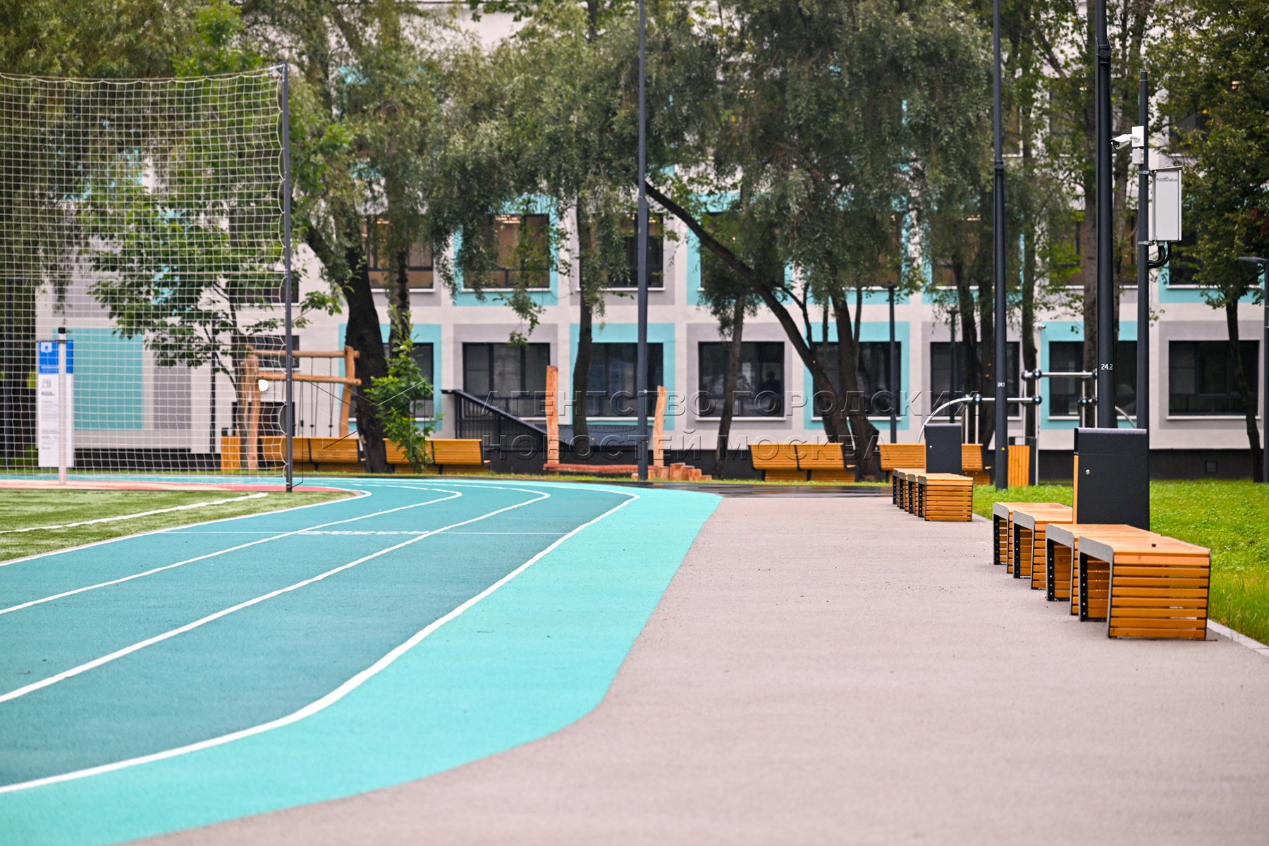 Беговая дорожка на пришкольной территории. Итоги реконструкции трехэтажного учебного корпуса школы №534 в районе Зябликово. Фото: Максим Мишин, пресс-служба мэра и правительства Москвы.