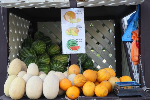 Городские точки торговли дынями и арбузами на улицах Москвы.