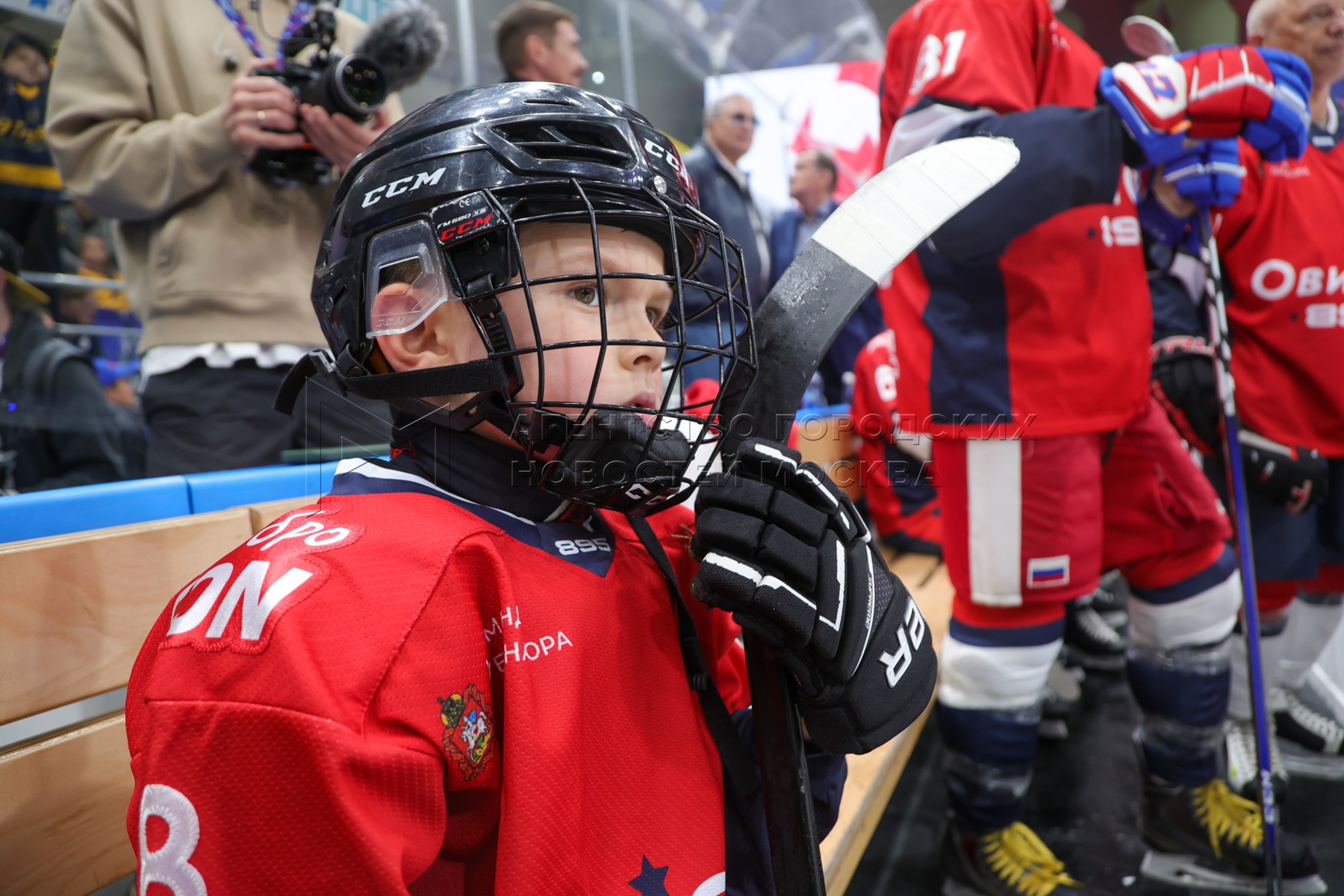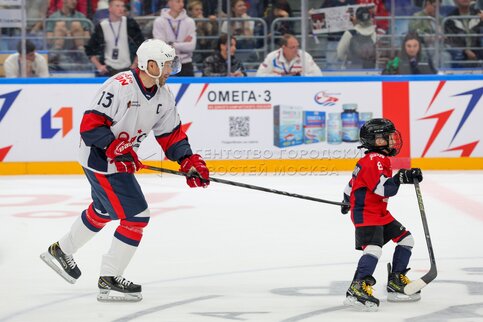 - Описание: Хоккеист Александр Овечкин и его старший сын Сергей во время матча звезд по хоккею на Кубке Александра Овечкина между командами Александра Овечкина и Павла Дацюка в ледовом дворце «Арена Мытищи».