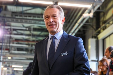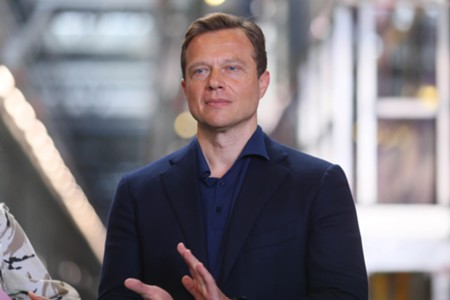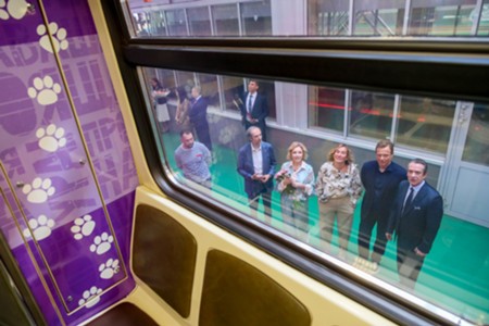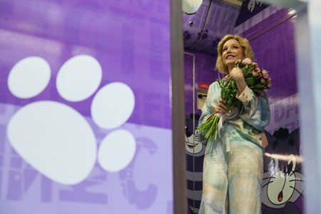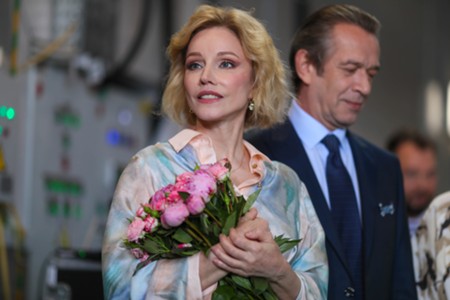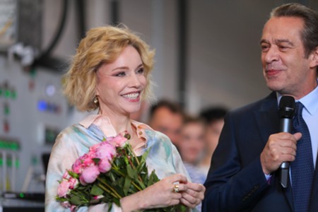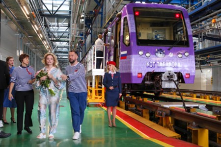 Вдова О. Табакова, народная артистка России Марина Зудина, художественный руководитель Театра Олега Табакова Владимир Машков, председатель совета директоров киностудии «Союзмультфильм» Юлиана Слащева и заместитель мэра Москвы по вопросам транспорта Максим Ликсутов (слева направо). Запуск в электродепо «Аминьевское» тематического поезда с оформлением к 90-летию со дня рождения народного артиста СССР Олега Табакова.