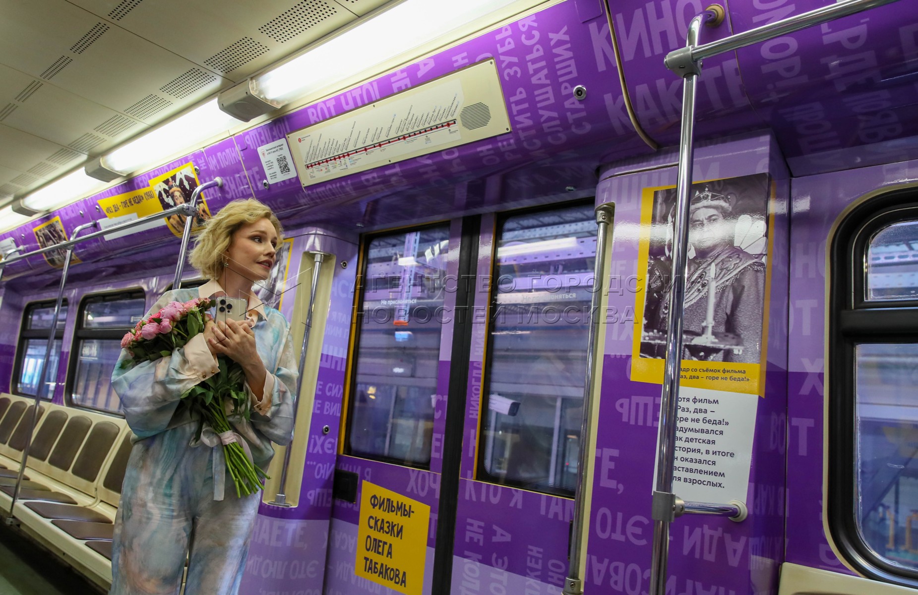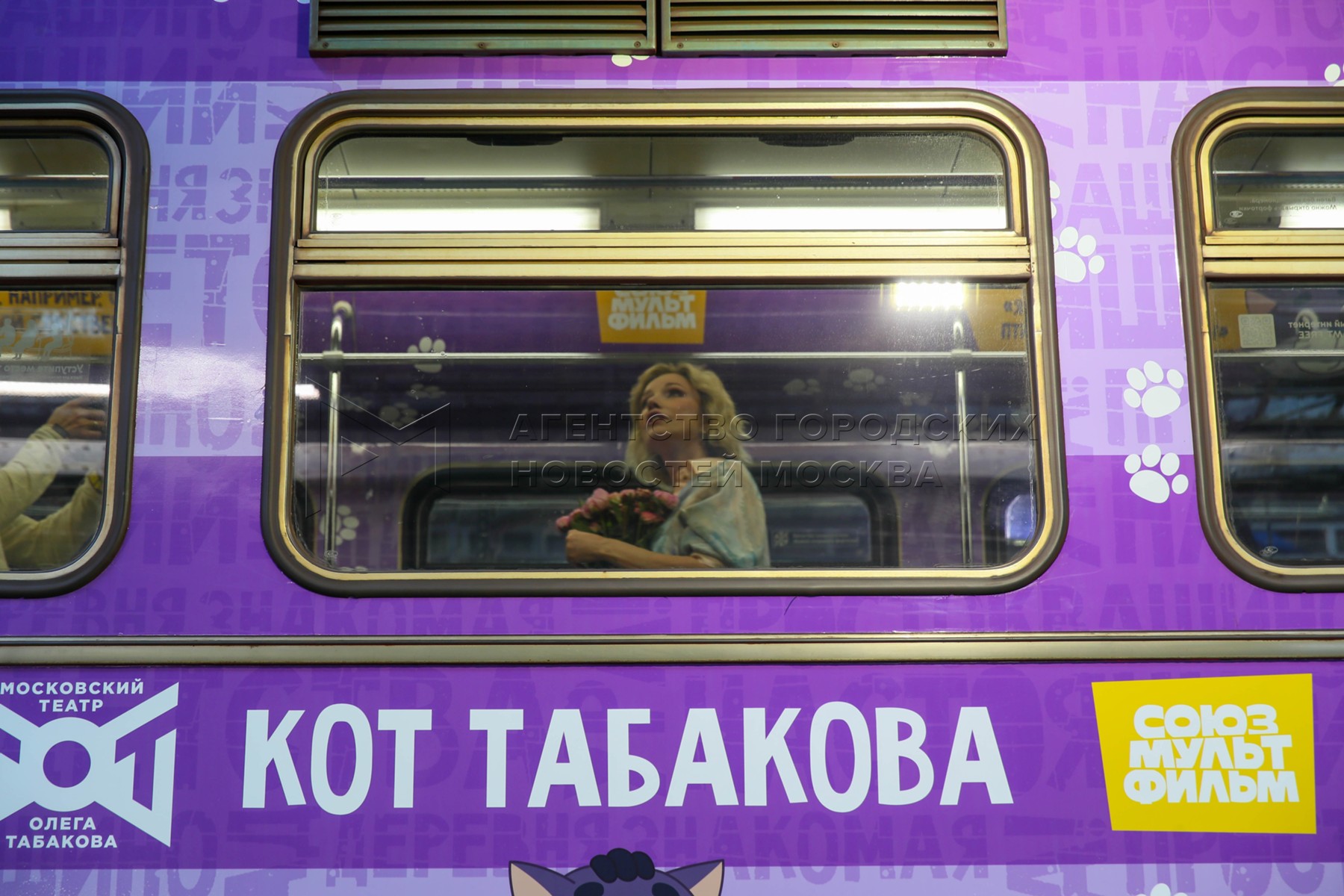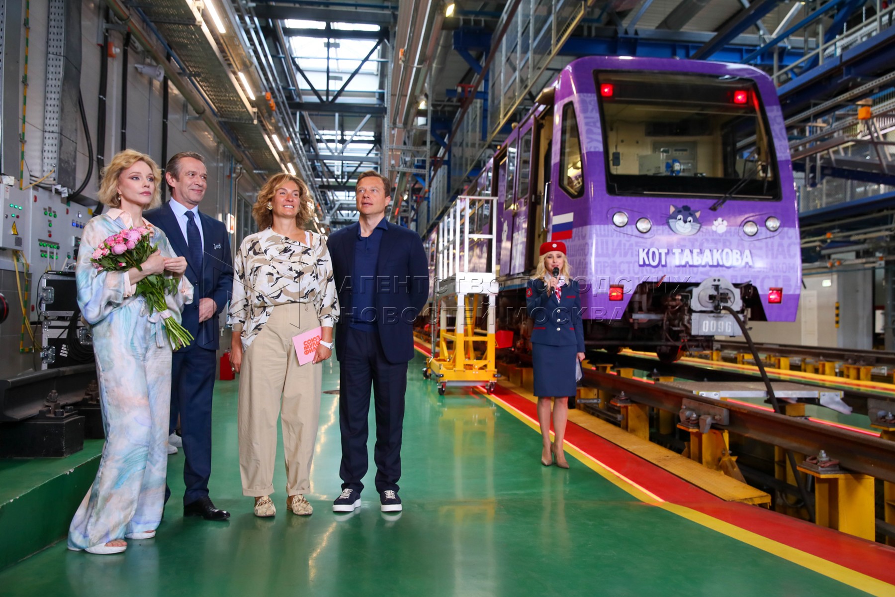 - Описание: Вдова О. Табакова, народная артистка России Марина Зудина, художественный руководитель Театра Олега Табакова Владимир Машков, председатель совета директоров киностудии «Союзмультфильм» Юлиана Слащева и заместитель мэра Москвы по вопросам транспорта Максим Ликсутов (слева направо). Запуск в электродепо «Аминьевское» тематического поезда с оформлением к 90-летию со дня рождения народного артиста СССР Олега Табакова.
