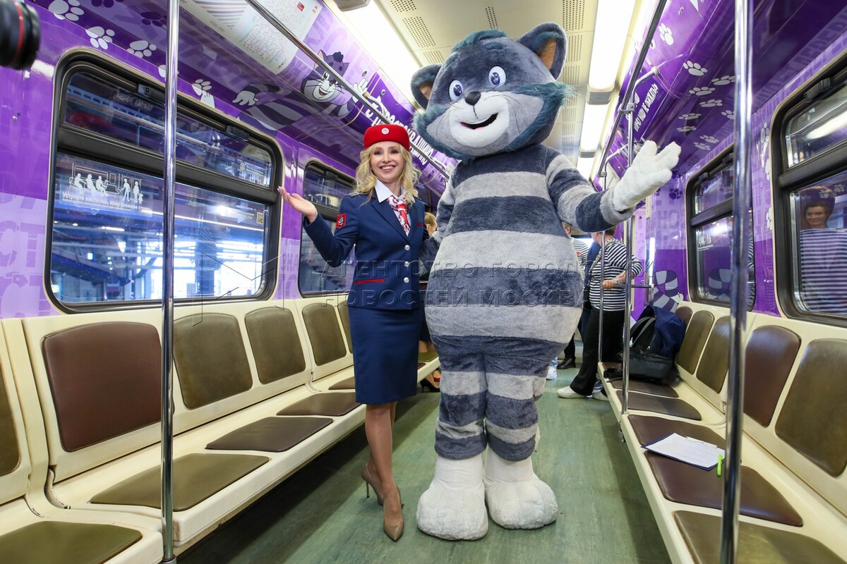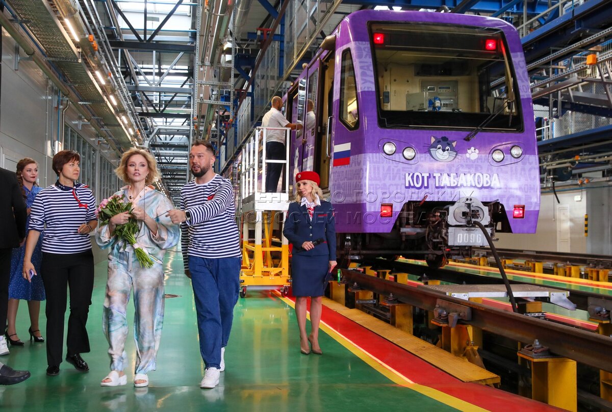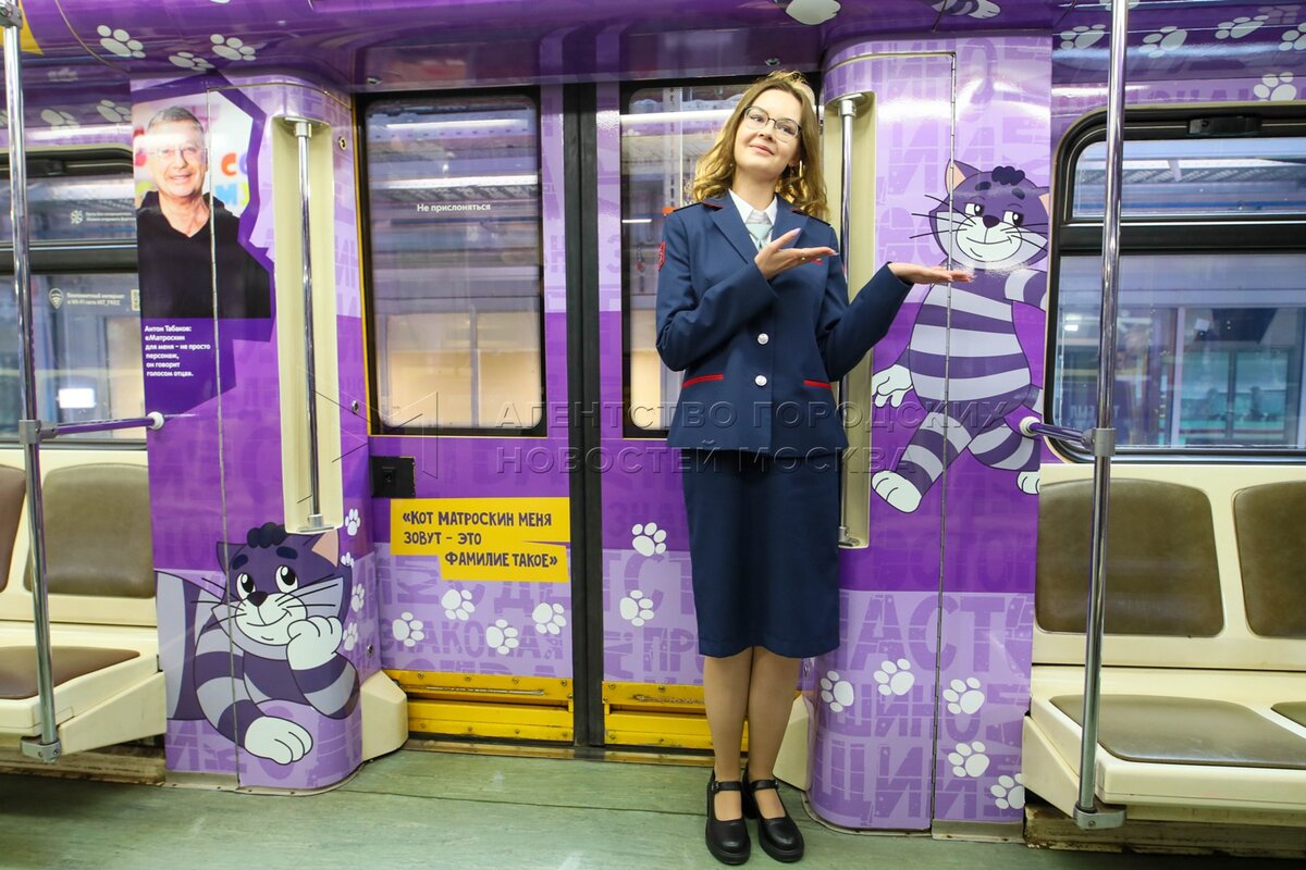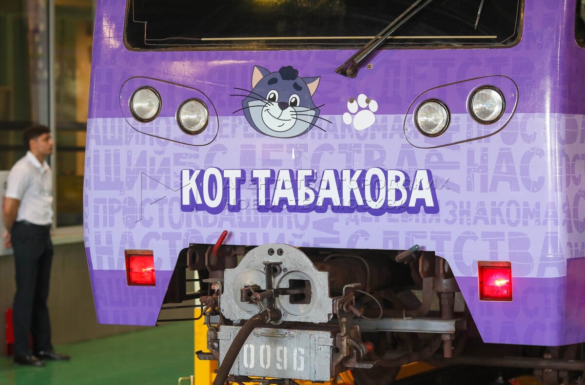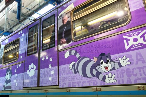 Изображение кота Матроскина – персонажа мультфильма «Каникулы в Простоквашино», озвученного Олегом Табаковым. Запуск в электродепо «Аминьевское» тематического поезда с оформлением к 90-летию со дня рождения народного артиста СССР Олега Табакова.