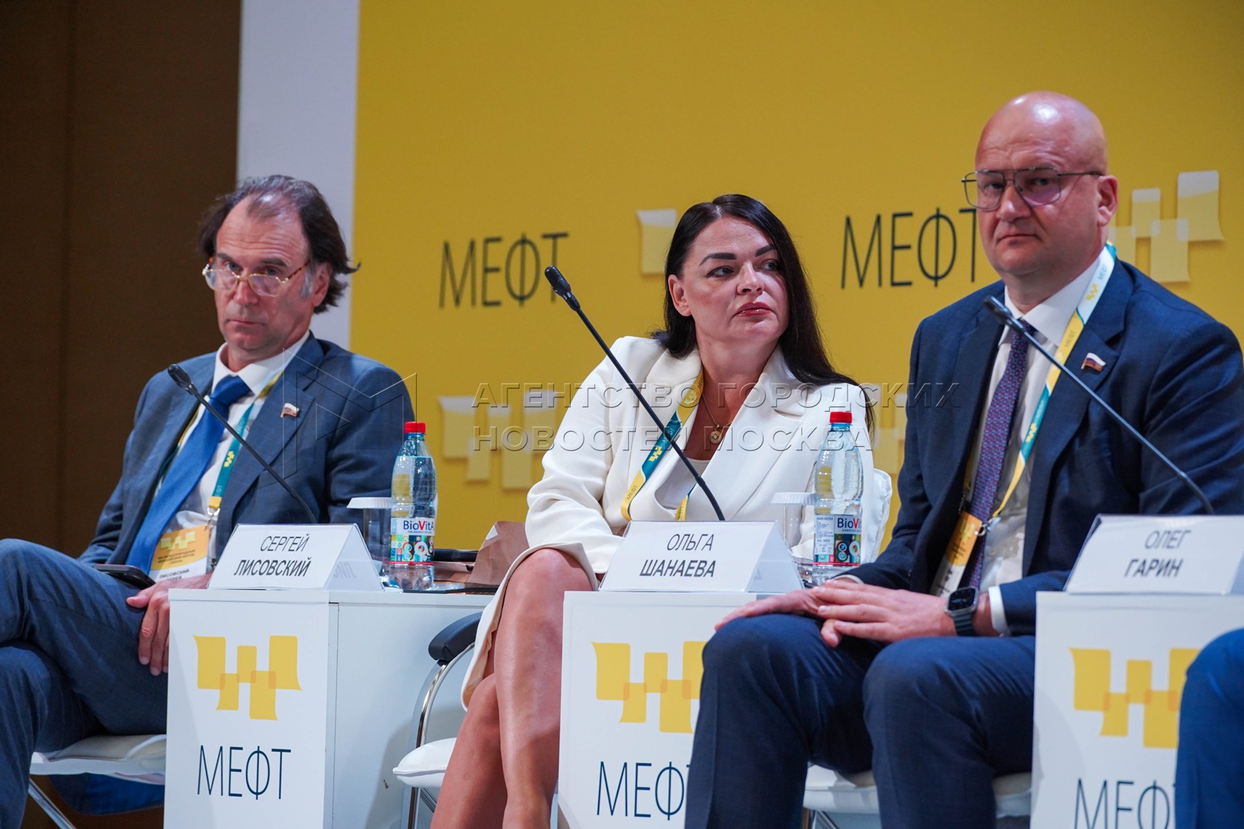 Заместитель председателя комитета Государственной Думы РФ по защите конкуренции Сергей Лисовский, заместитель руководителя Роскачества Ольга Шанаева и член Комитета Государственной Думы по транспорту и развитию транспортной инфраструктуры Олег Гарин (слева направо) во время пленарного заседания «Построить маршрут: прибыль и легализация, ответственность и компромиссы». XIII Международный Евразийский форум «Такси» в конгресс-центре Центра международной торговли.
