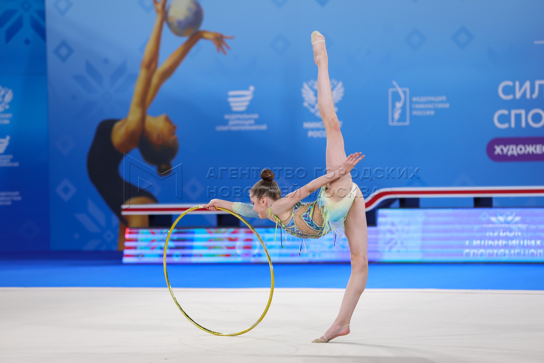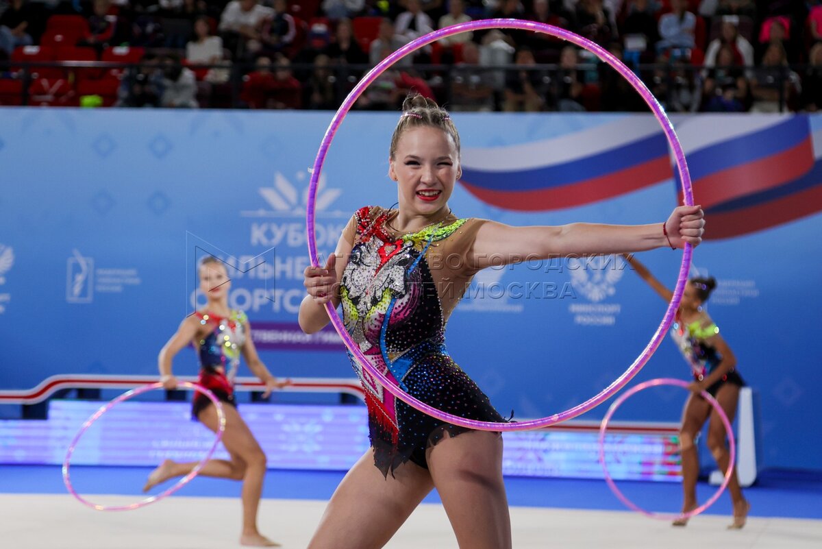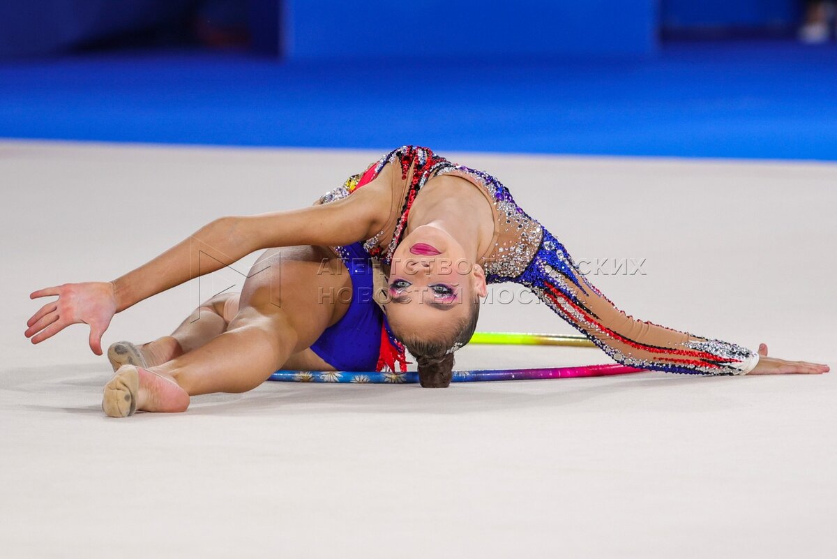 Упражнения с обручем во время индивидуальной программы гимнасток в заключительный...