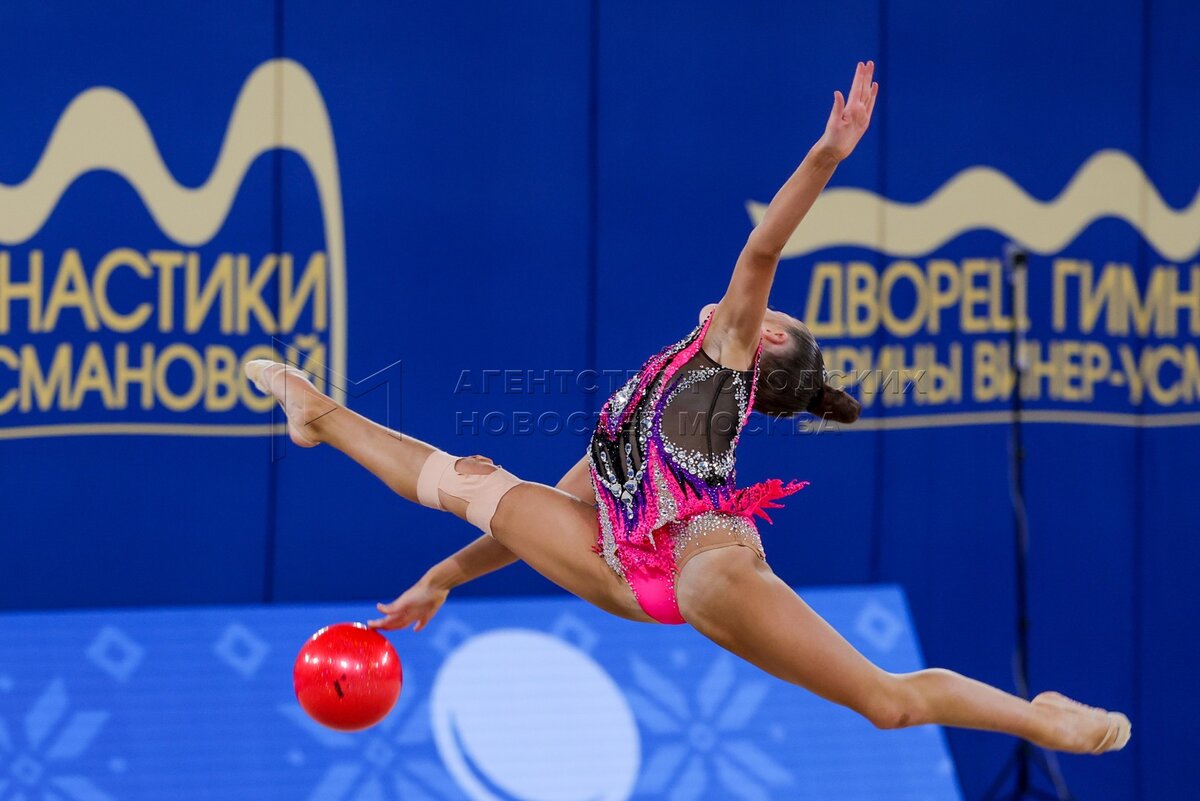 Упражнения с мячом во время индивидуальной программы гимнасток в заключительный д...