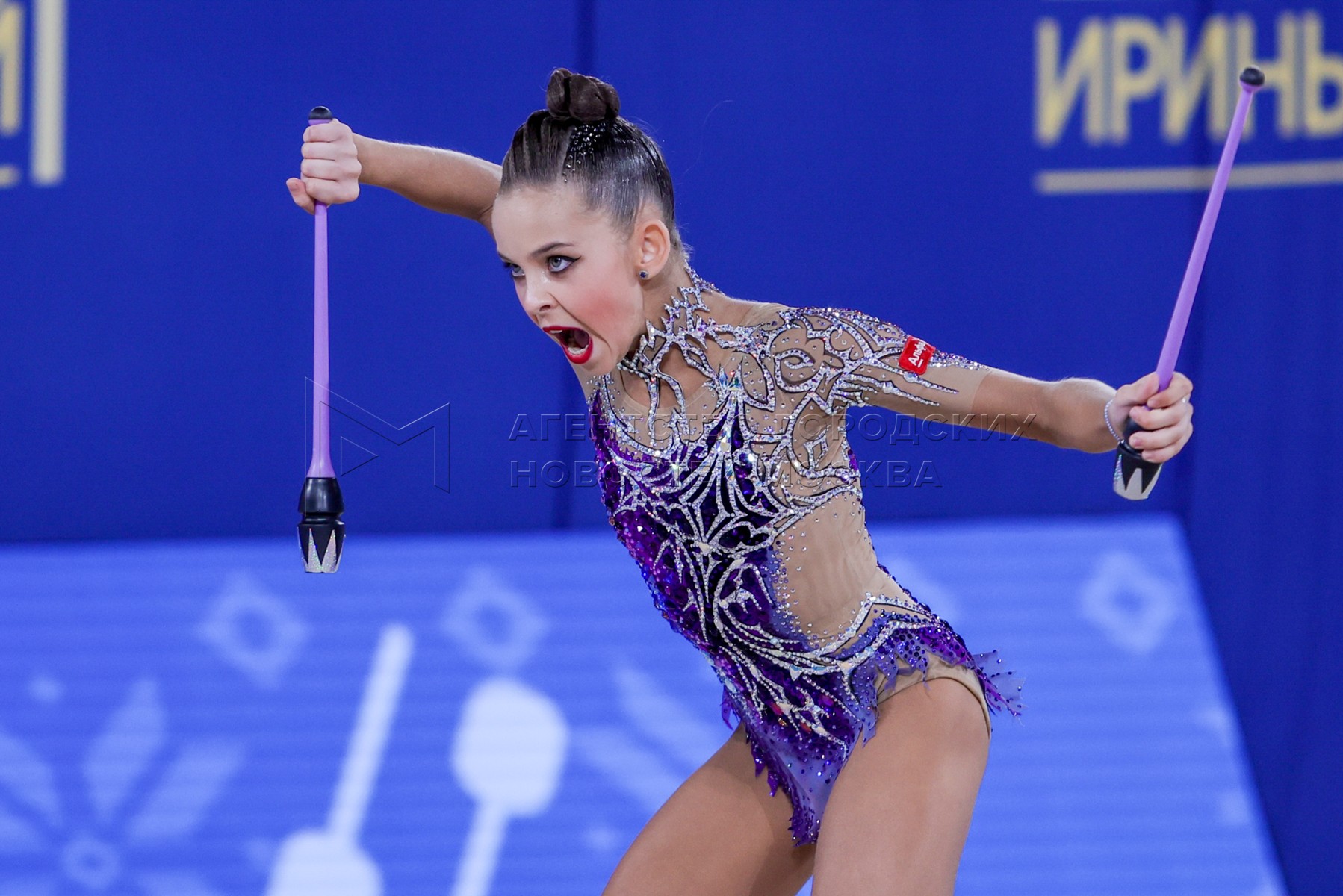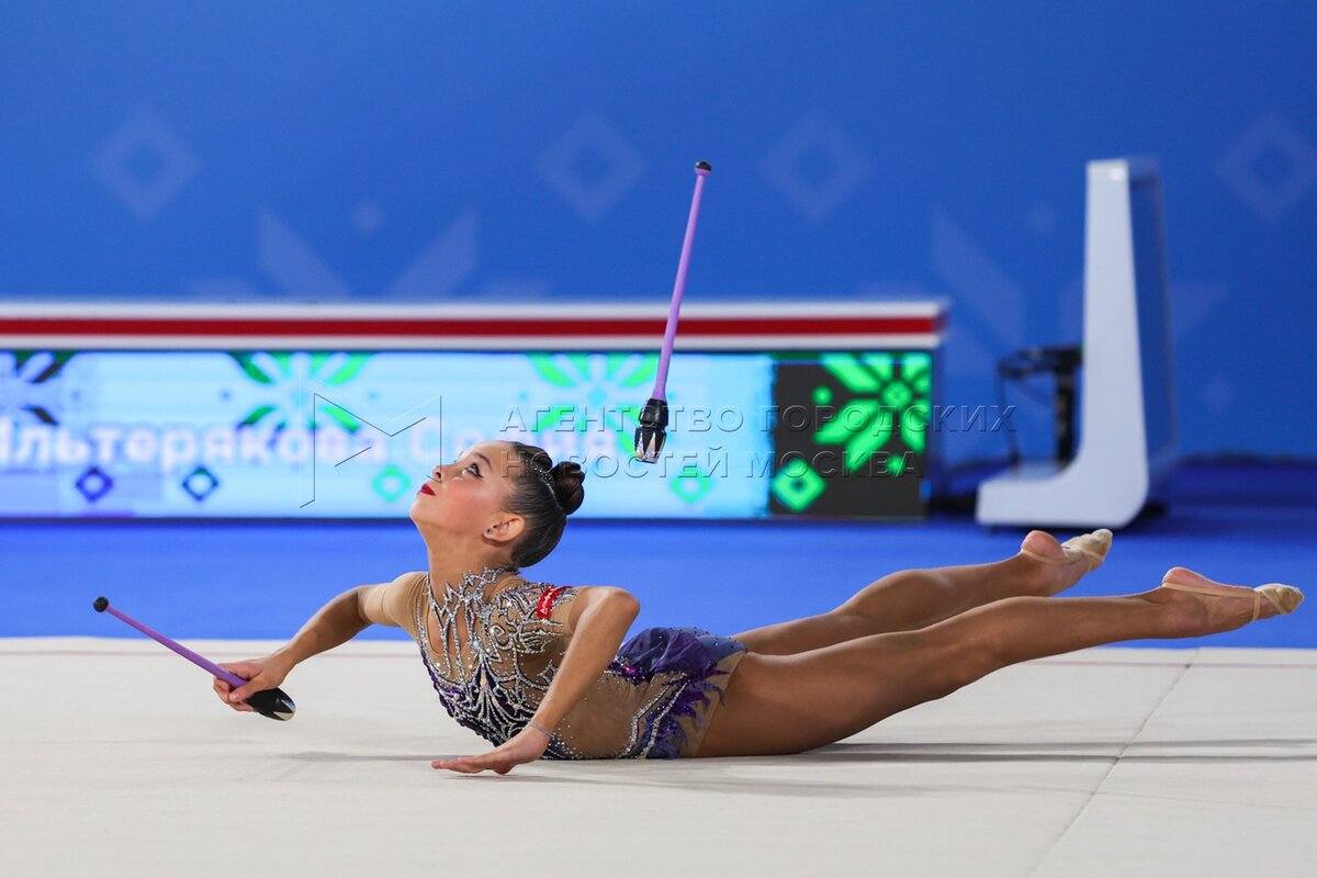 Упражнения с булавами во время индивидуальной программы гимнасток в заключительны...