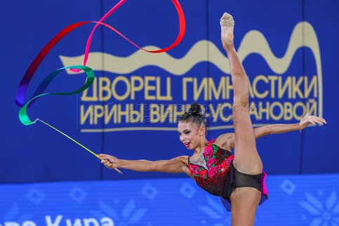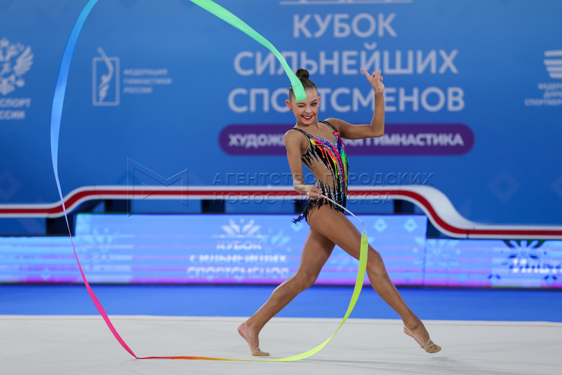 Упражнения с лентой во время индивидуальной программы гимнасток в заключительный день международных соревнованиях по художественной гимнастике «Кубок Сильнейших спортсменов» во Дворце Ирины Виннер в олимпийском комплексе «Лужники».