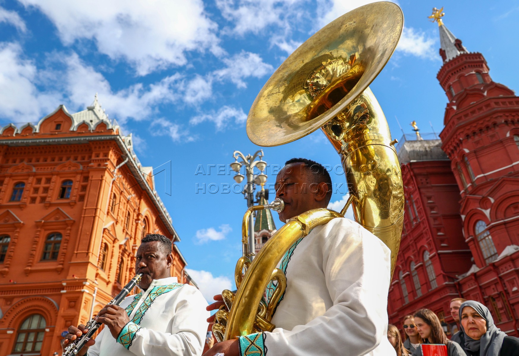 Выступление оркестра Национальных сил обороны Эфиопии в рамках фестиваля «Спасская башня» на Манежной площади.