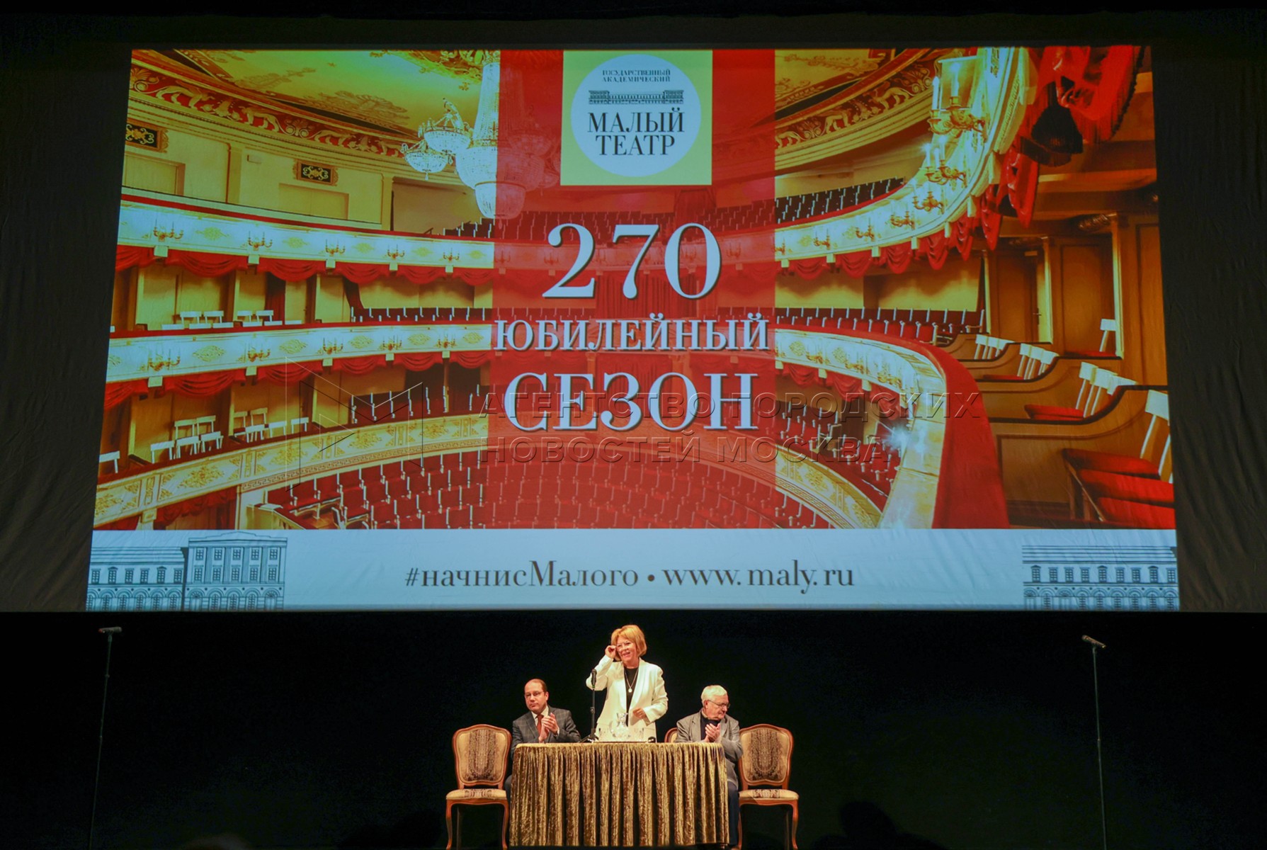 Заслуженная артистка РФ Екатерина Базарова, режиссер Владимир Бейлис и народная артистка РФ Елена Харитонова. Сбор труппы Государственного академического Малого театра перед началом 270-го театрального сезона.